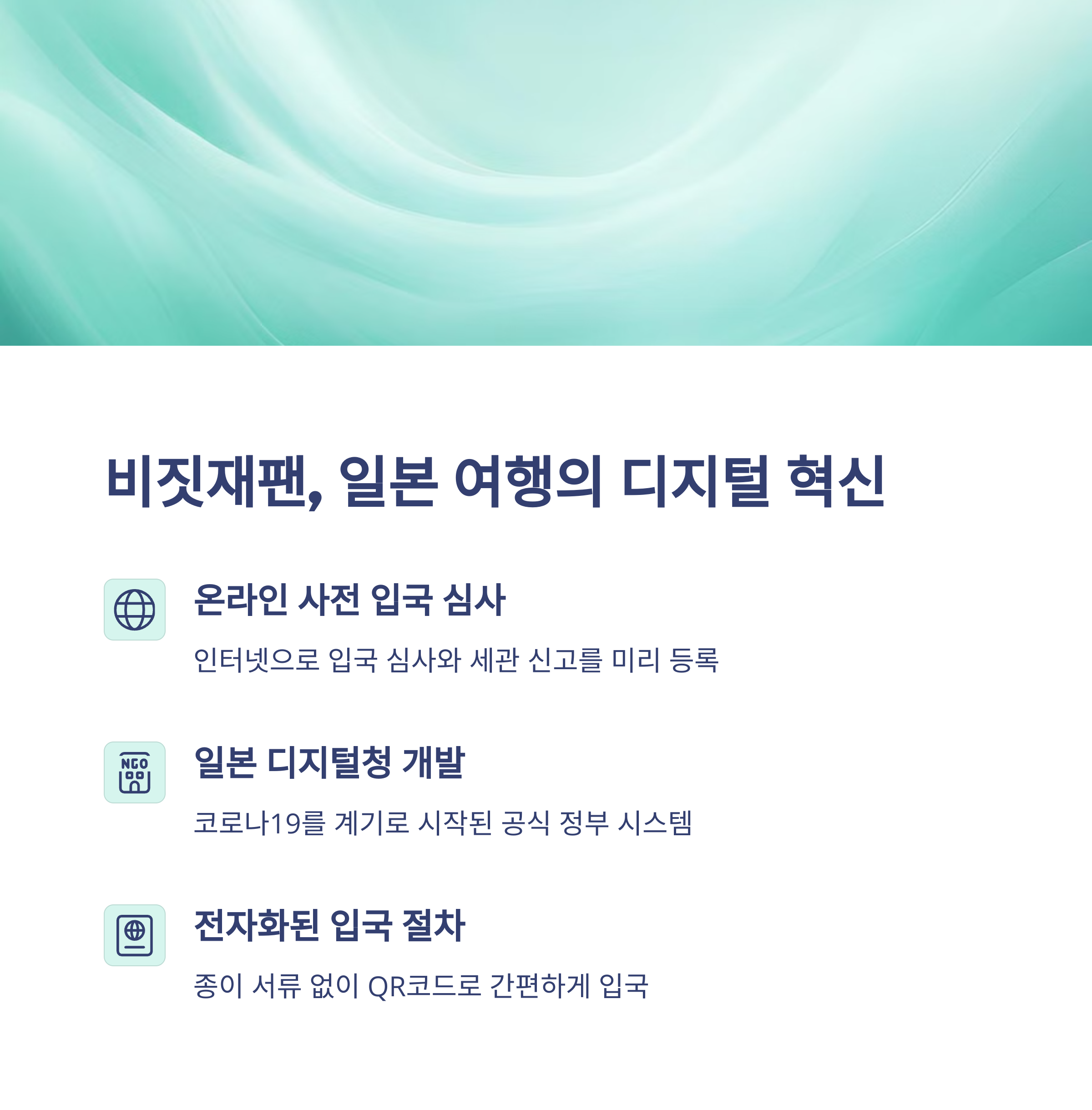 비짓재팬은 일본 입국 심사를 대폭 간소화하고, 긴 대기 시간을 줄여주는 필수 시스템입니다.