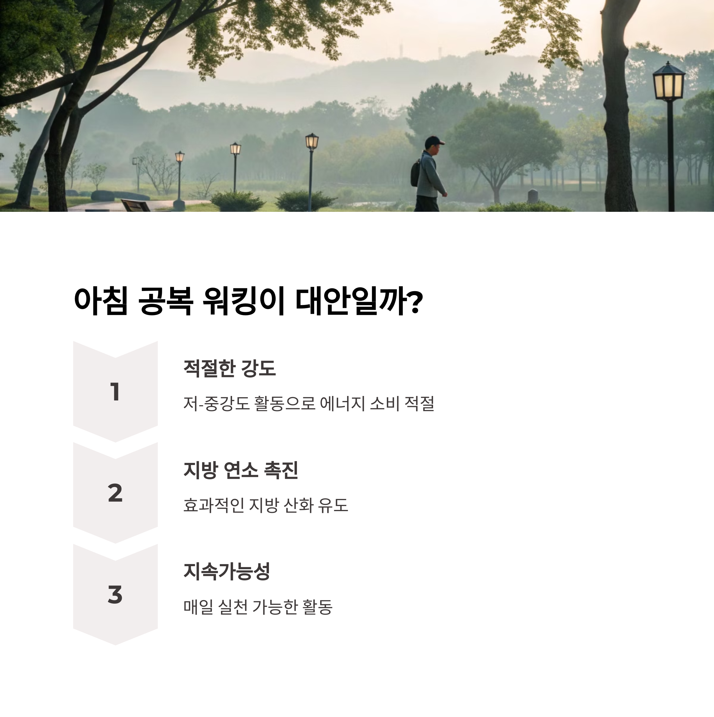 공복 유산소 운동은 다양한 효과와 함께 개인 맞춤형 전략이 필요합니다. 지방을 더 효과적으로 연소시킬 수 있는 기회를 제공하지만, 무리한 실천은 오히려 건강에 부정적 영향을 줄 수 있습니다. 중요한 것은 꾸준함과 균형입니다. 아침 시간을 활용해 가벼운 산책이나 워킹으로 몸을 깨우는 것만으로도 건강한 하루를 시작할 수 있습니다. 간헐적 단식이나 개인의 식습관과 적절히 조합하여 나만의 운동 루틴을 구성해보세요. 실천 가능한 범위에서 꾸준히 지속해 나간다면, 공복 유산소는 여러분의 건강한 삶에 큰 도움이 될 것입니다.