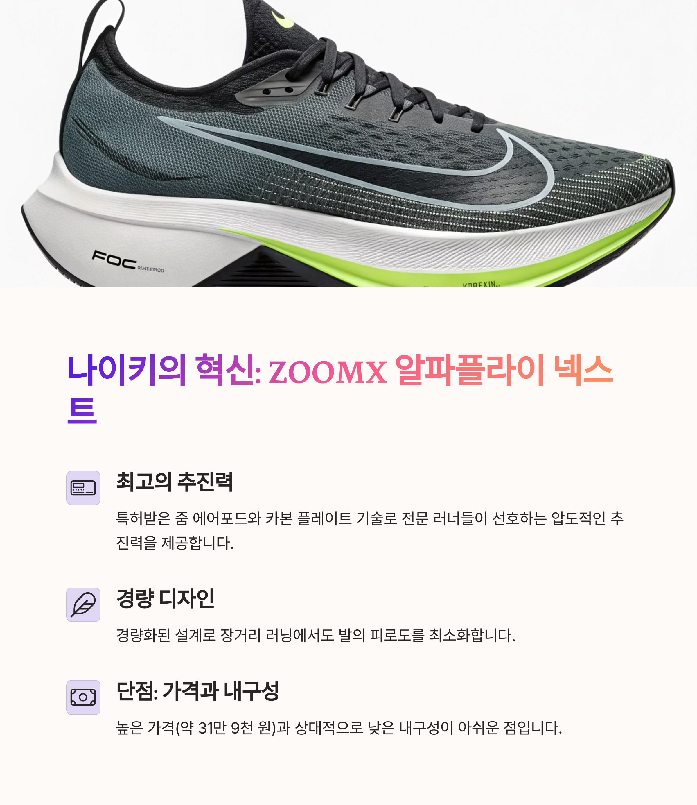 | Q. 나이키 줌X 알파플라이 넥스트%의 주요 장점은 무엇인가요? |