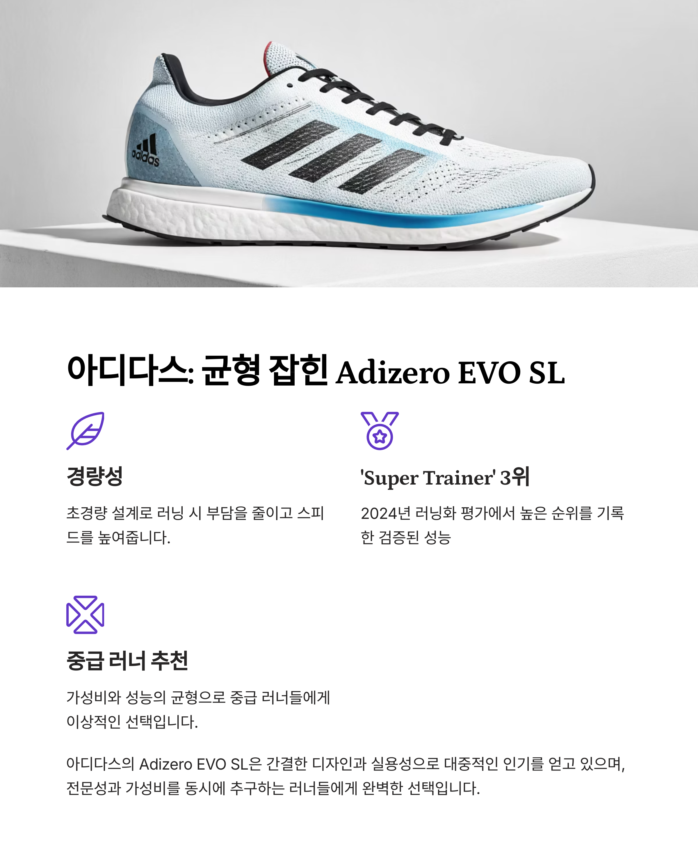 반면, 아디다스 Adizero EVO SL은 디자인과 성능을 모두 갖춘 모델로 많은 중급 러너들에게 인기가 높습니다.