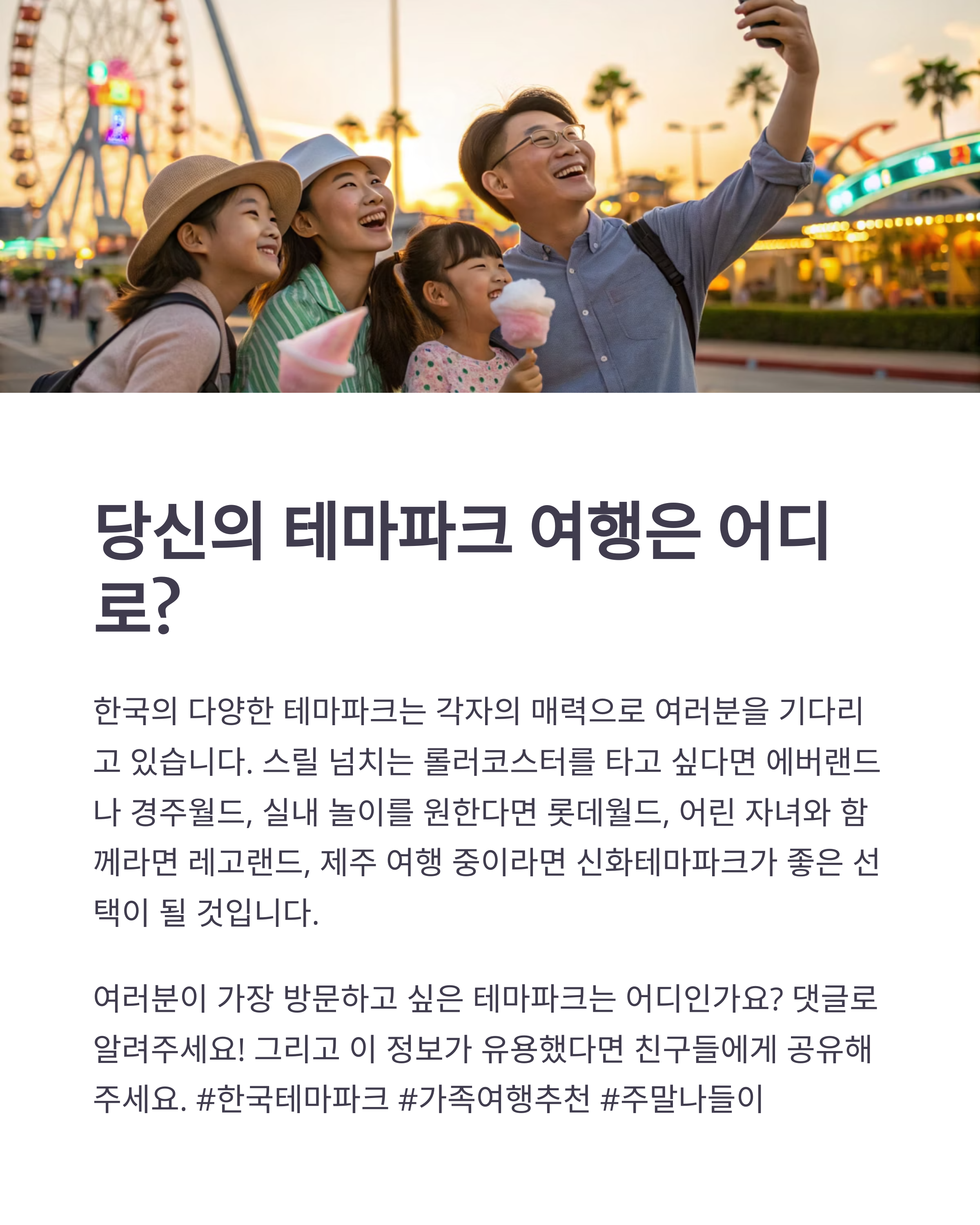 어떤 테마파크를 선택하든 추억 가득한 시간을 보낼 수 있을 것입니다.