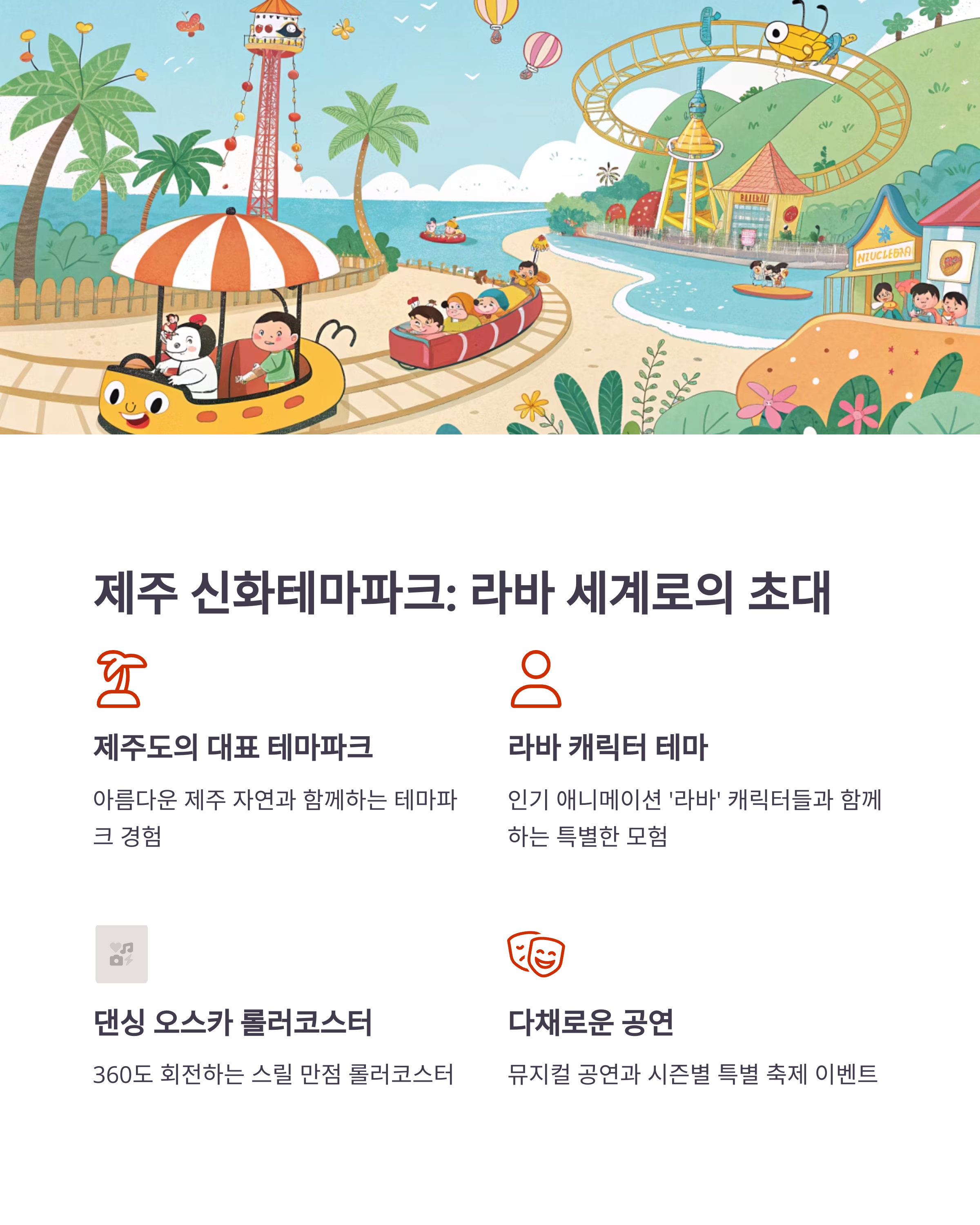 제주 신화테마파크는 한국 애니메이션 '라바'를 테마로 독특한 분위기를 형성하며 접근성을 고려한 시설이 잘 갖추어져 있습니다.