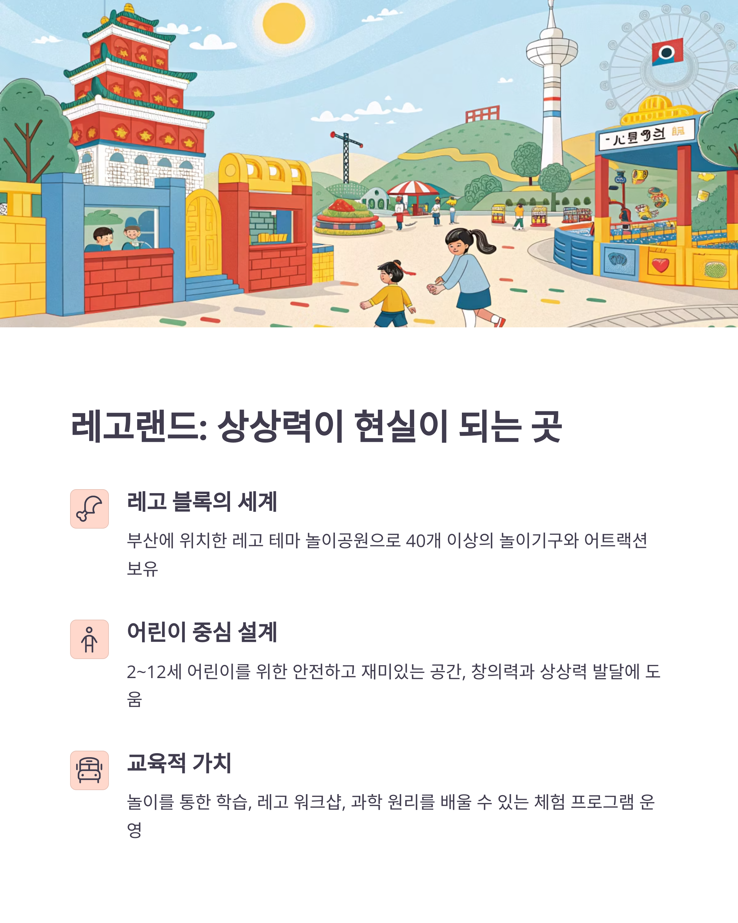 가족 단위 방문객이라면 레고랜드와 롯데월드에서 즐거운 시간을 보낼 수 있습니다.