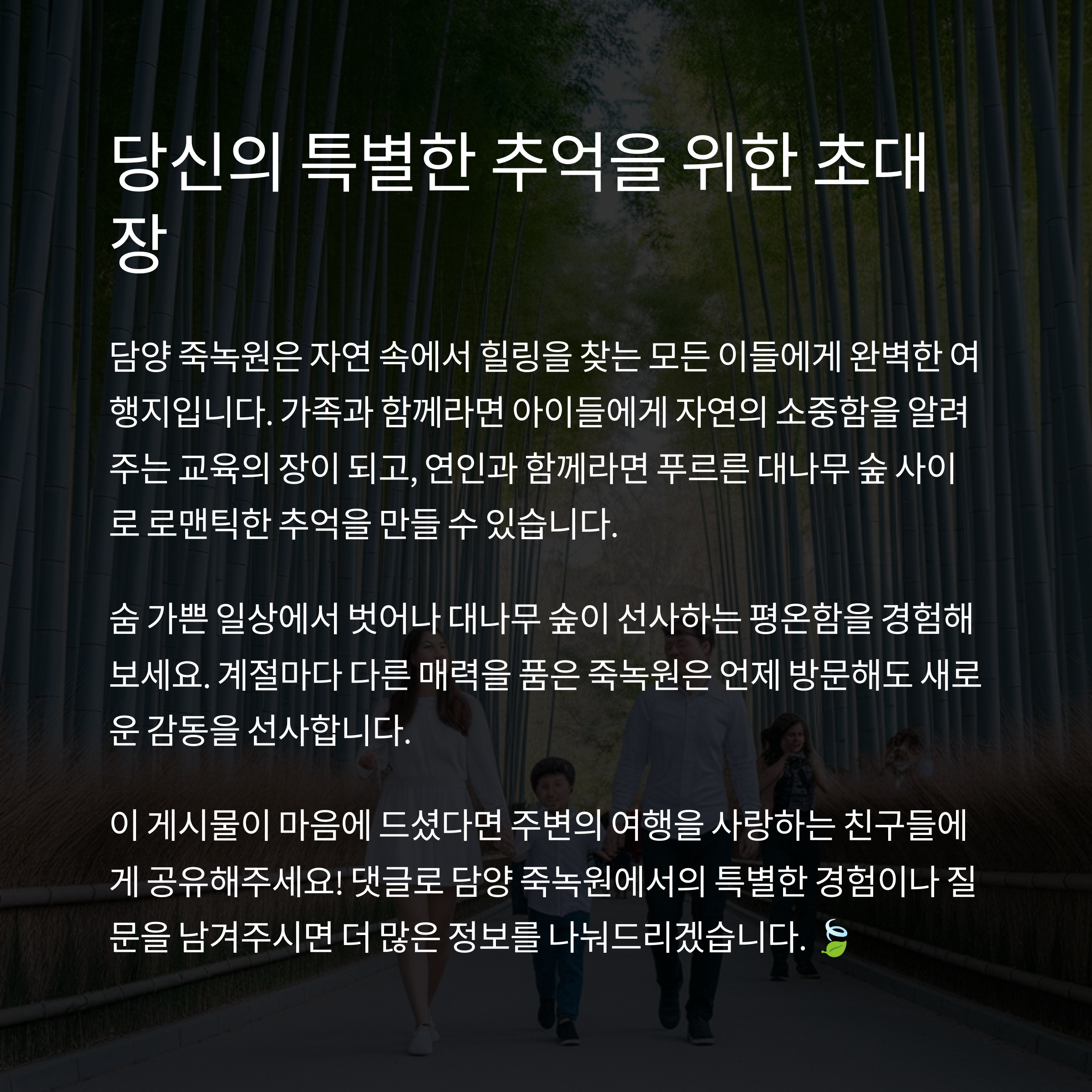 담양 죽녹원을 방문해보신 경험이 있으신가요? 여러분만의 추천 코스나 계절별 팁이 있다면 댓글로 공유해 주세요. 또 다른 궁금한 여행지가 있다면 알려주세요! 함께 알아보겠습니다.