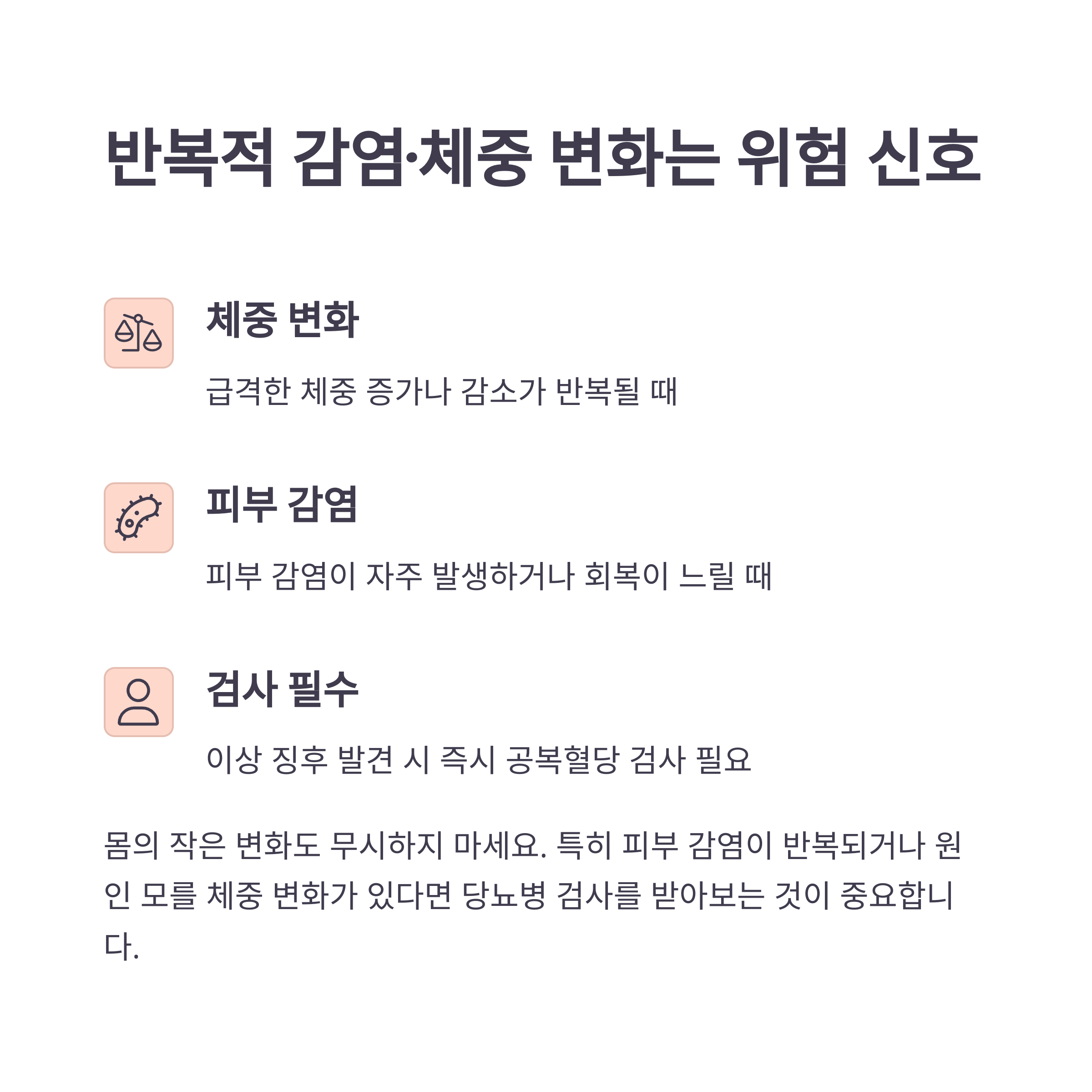 | 당뇨 초기증상을 방치하면 주요 신체기관이 손상됩니다. 시력 저하는 당뇨망막병증의 첫 신호로, 실명 위험이 25%에 이릅니다. 말초신경 손상은 족부궤양 등 심각한 합병증으로 발전할 수 있습니다. 신장 기능 저하는 혈당 조절 부족 시 투석 위험을 40%까지 높입니다. 혈당 관리는 초기 단계에서 이러한 합병증을 예방하는 첫걸음입니다. |