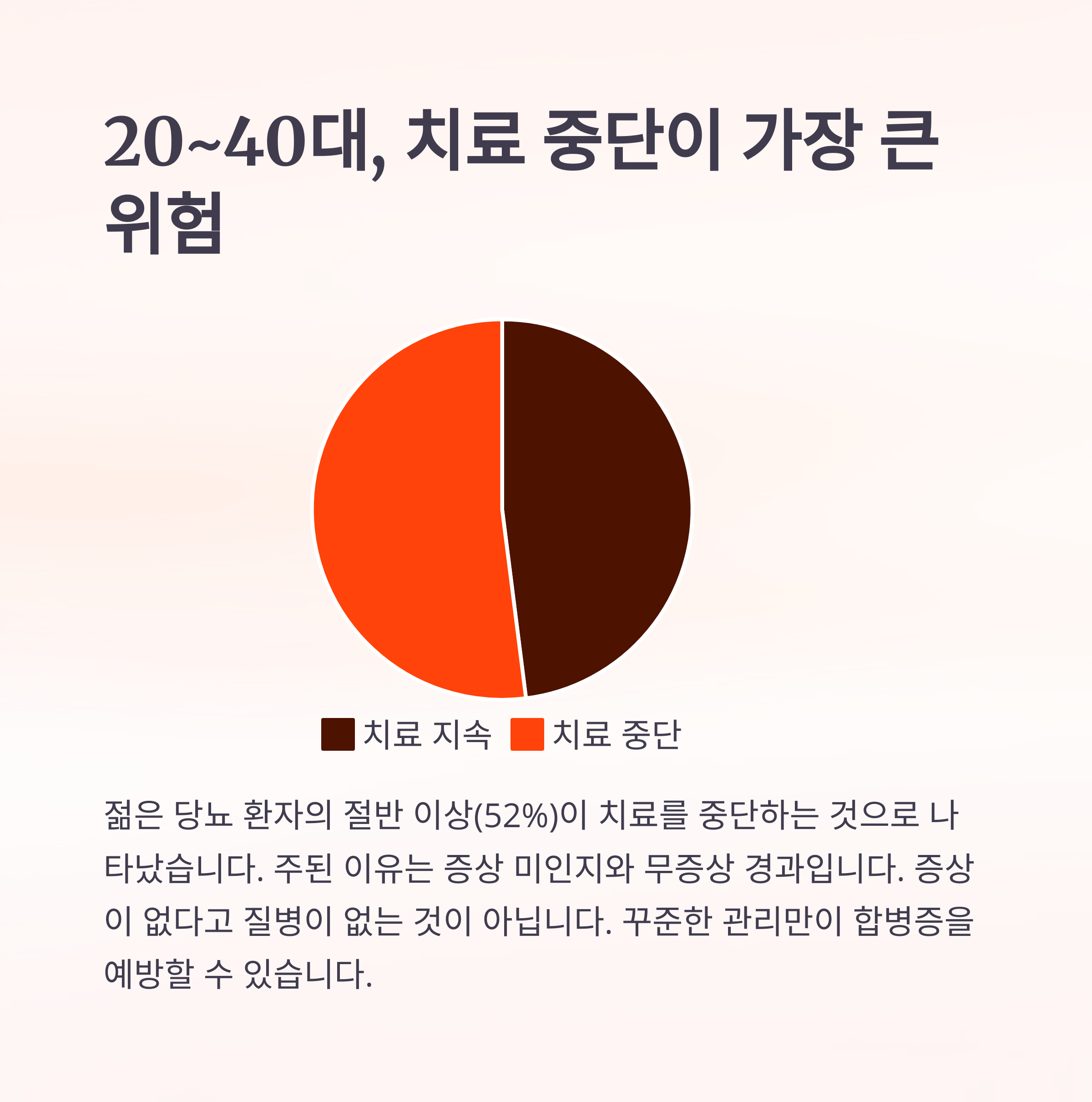 | 젊은 층의 당뇨병은 합병증이 늦게 발견될 가능성이 높습니다. 무증상 경과로 인해 60% 이상이 진단 시 이미 합병증이 존재합니다. 치료 거부율은 1년 내 약 52%로, 관리 소홀 위험이 크다는 점이 문제입니다. 케톤산혈증과 같은 급성 합병증 위험은 노인의 3배로 나타났습니다. 정기 검진과 꾸준한 관리가 특히 젊은 층에서 중요합니다. |