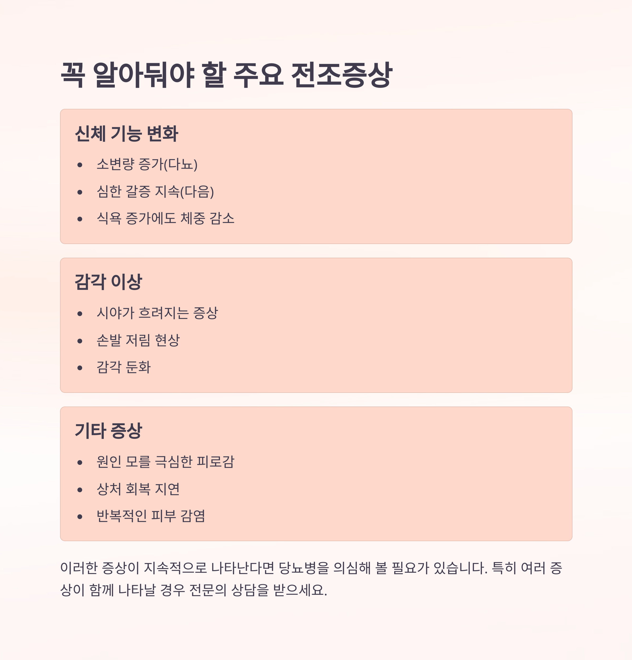 당뇨 초기증상을 방치하면 주요 신체기관이 손상됩니다. 시력 저하는 당뇨망막병증의 첫 신호로, 실명 위험이 25%에 이릅니다. 말초신경 손상은 족부궤양 등 심각한 합병증으로 발전할 수 있습니다. 신장 기능 저하는 혈당 조절 부족 시 투석 위험을 40%까지 높입니다. 혈당 관리는 초기 단계에서 이러한 합병증을 예방하는 첫걸음입니다. |
