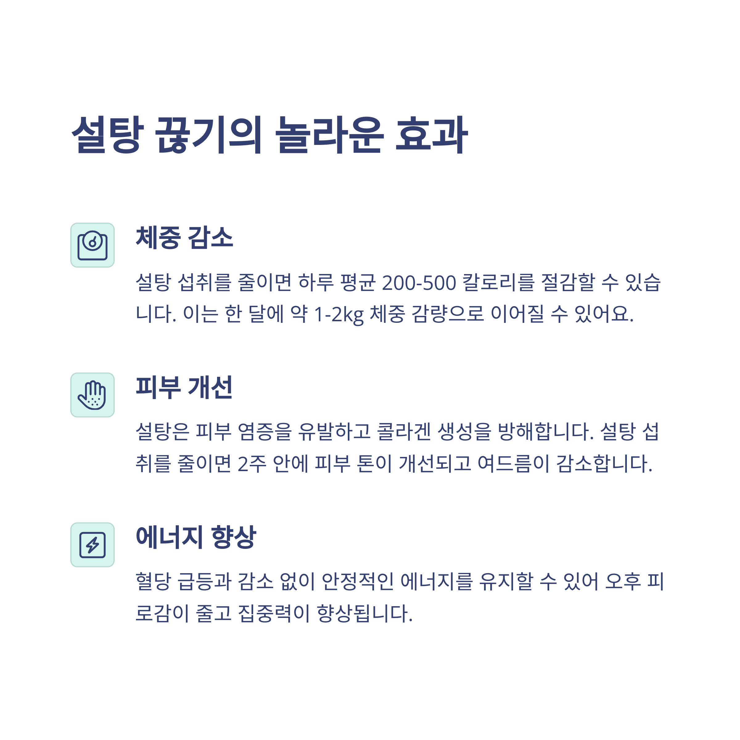 | 건강한 삶을 위한 필수 실천 | 설탕 욕구 줄이기와 체중 감량에 효과적 | 활기찬 하루를 위한 필수 요소 |