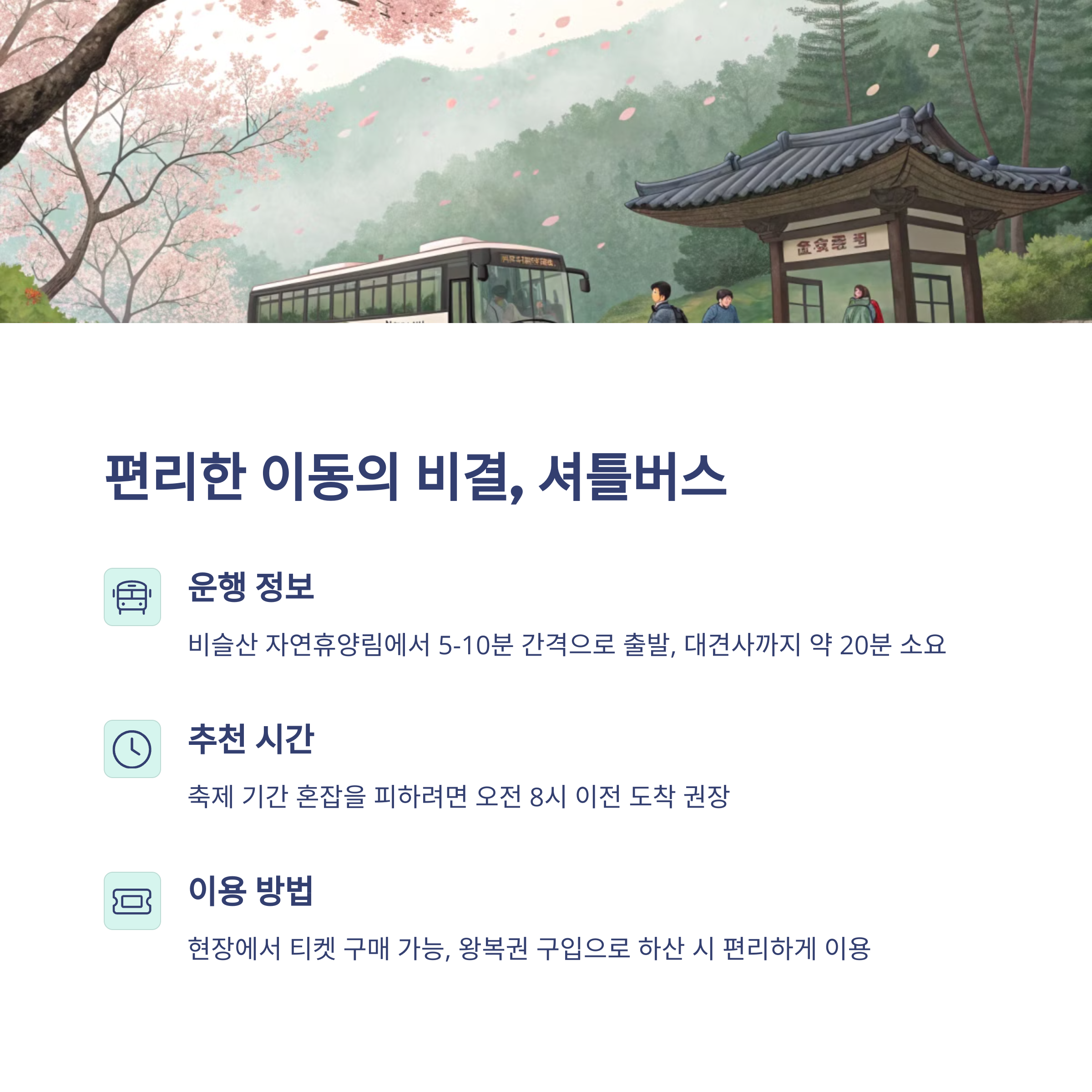 | 4월 중순에 절정, 사진 명소로 유명 | 자연휴양림 공용주차장에서 탑승 가능 | 계절과 코스에 맞는 복장과 장비가 중요 |