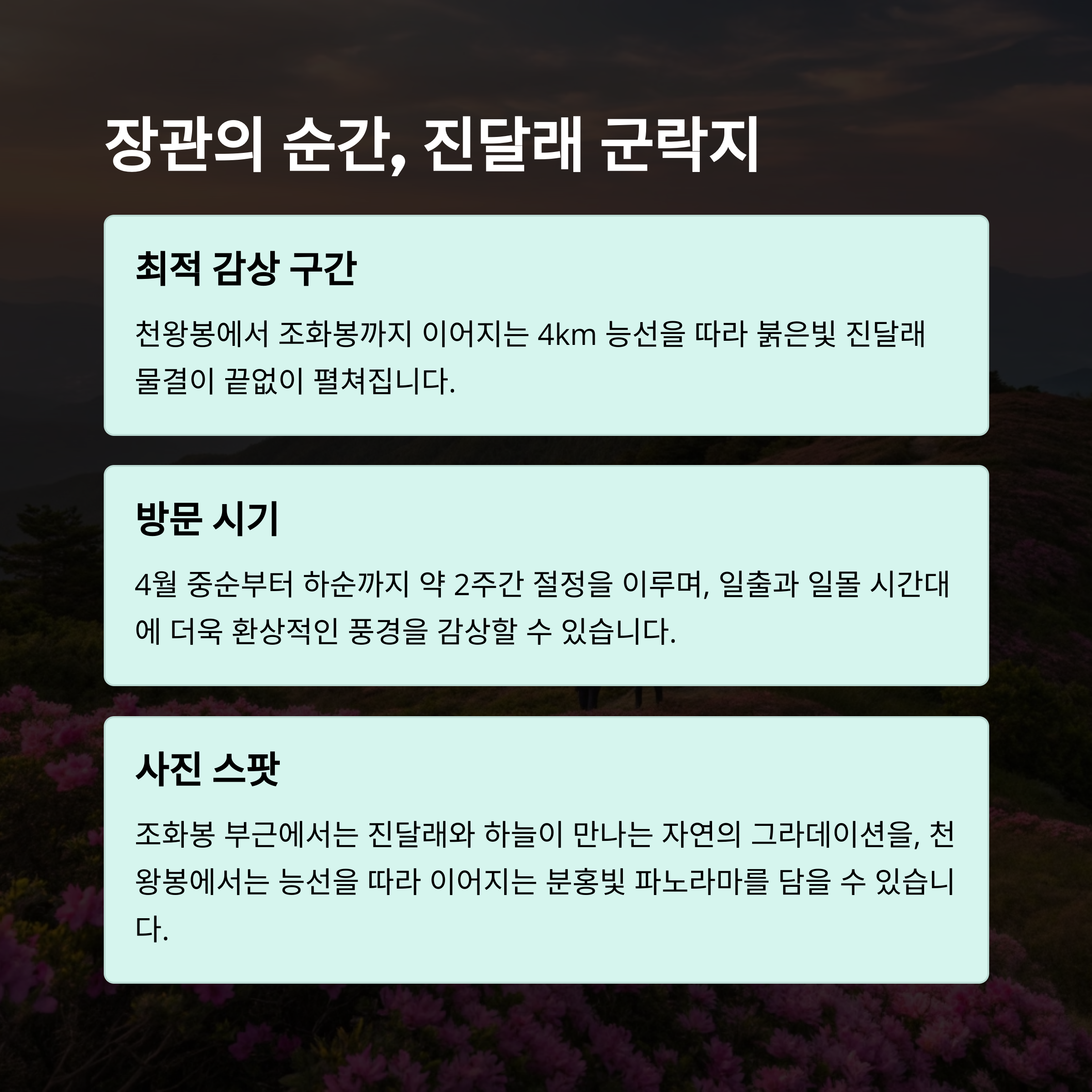 전국 최대 규모의 진달래 군락지가 있는 산 | 축제 기간 무료 운영으로 접근성 향상 | 물, 간식, 등산화, 방한복, 비상약 등 필수 |