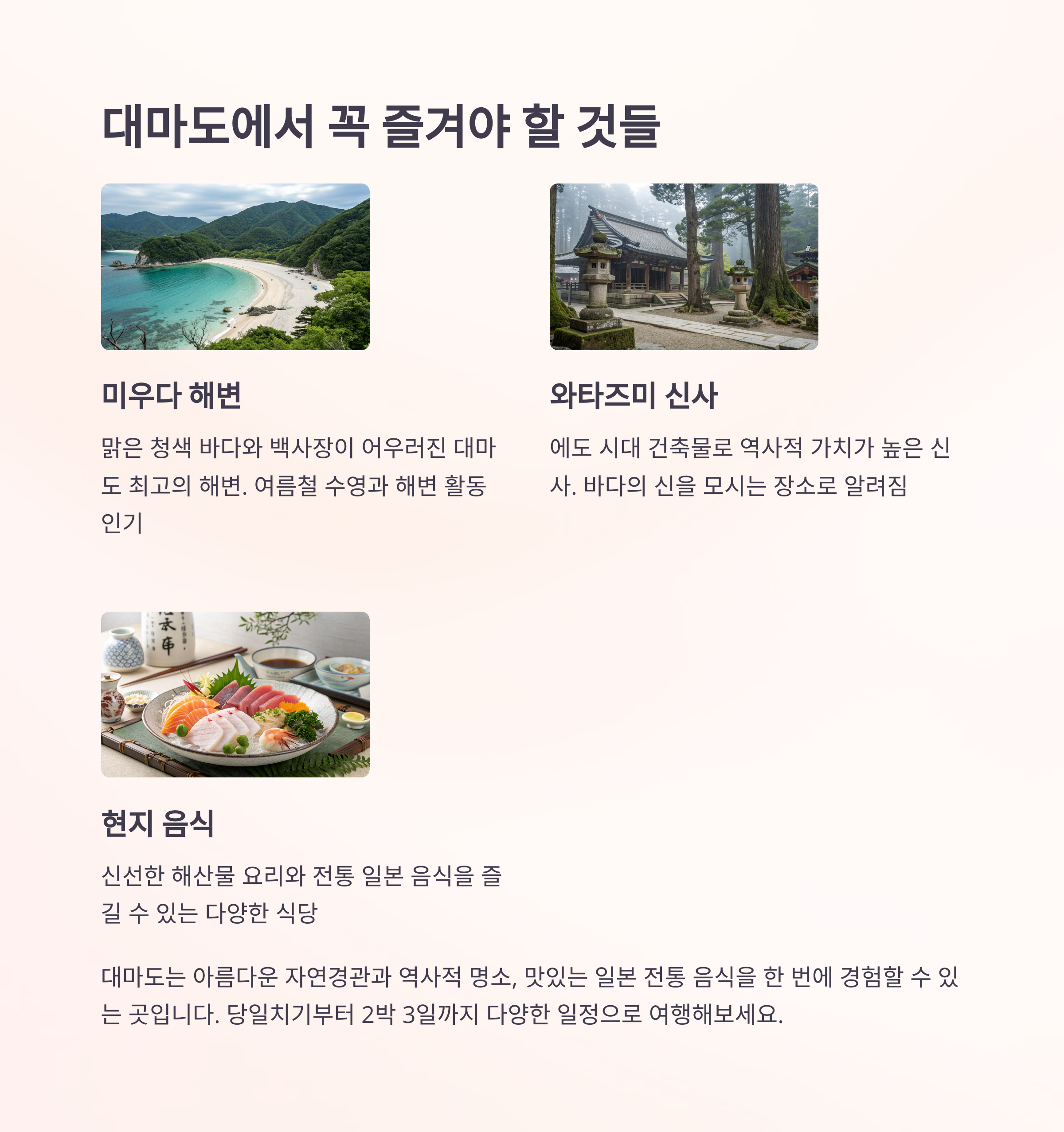 앞으로도 대마도 여행이 더 많은 사람들에게 특별한 추억을 선사하길 기대합니다.