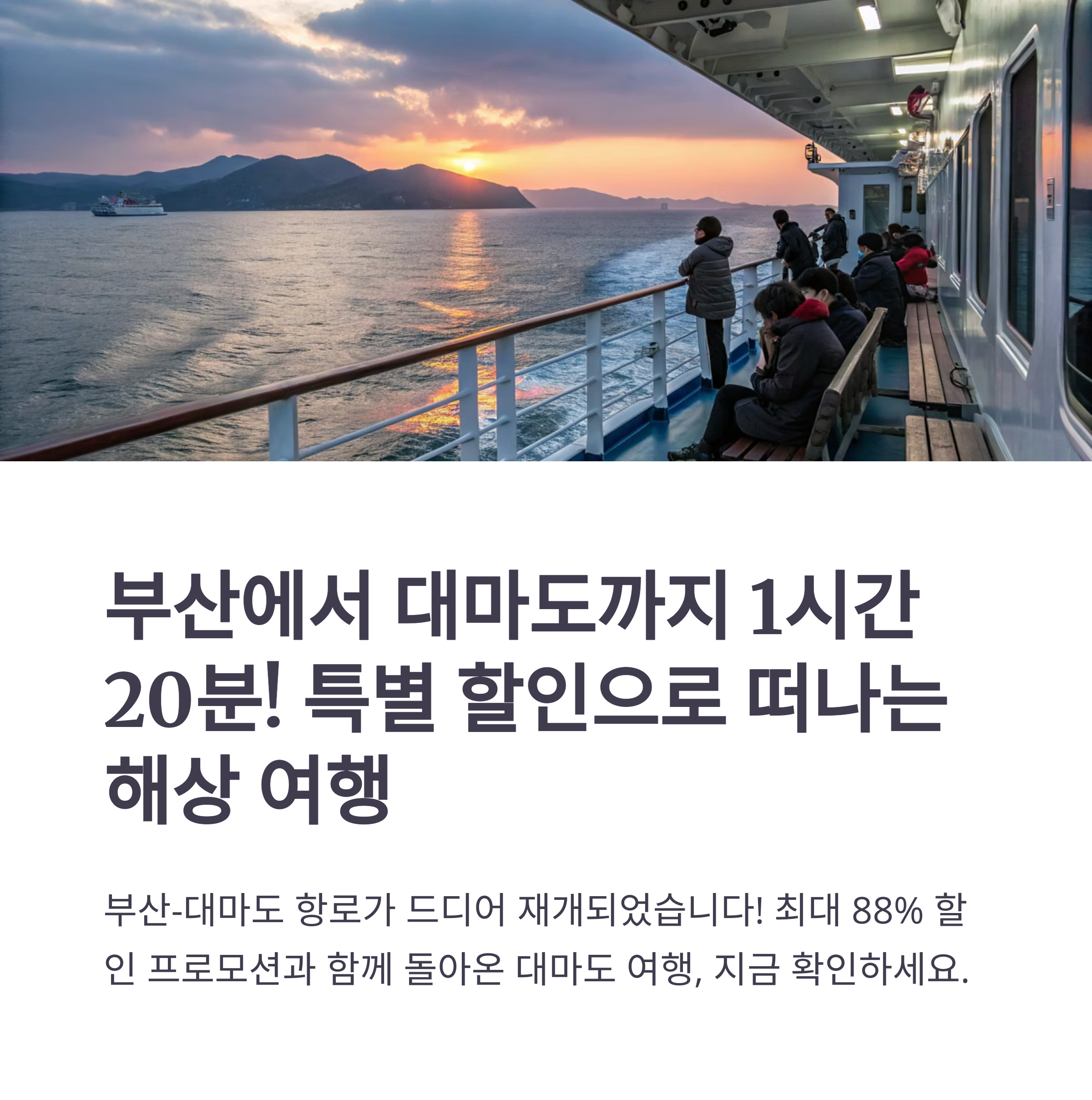 특히 대아고속해운은 재취항 기념 할인 프로모션을 진행 중이니 비용을 절약할 좋은 기회입니다.