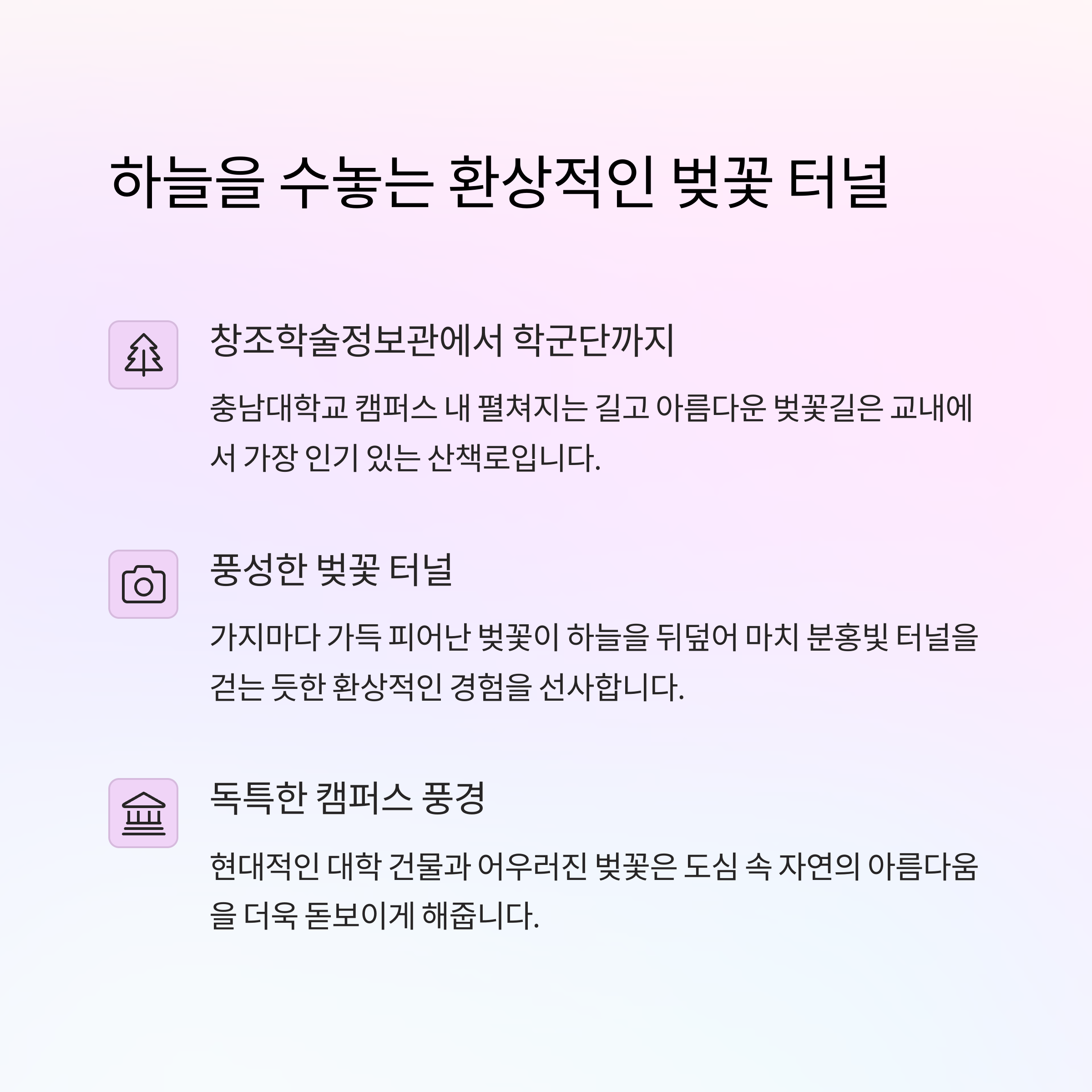 충남대학교는 봄철이면 캠퍼스 전체가 벚꽃으로 물드는 아름다운 풍경을 자랑합니다. 특히 대덕 캠퍼스의 창조학술정보관을 지나 정보화본부 교육관에서 학군단까지 이어지는 길은 벚꽃이 집중적으로 조성되어 있어, 벚꽃 터널을 따라 걸을 수 있는 특별한 경험을 제공합니다. 평소에는 조용한 캠퍼스가 이 시기만 되면 벚꽃을 즐기려는 방문객들로 활기를 띠며, 학생뿐만 아니라 시민들도 함께 봄을 만끽할 수 있는 공간으로 변신합니다.
