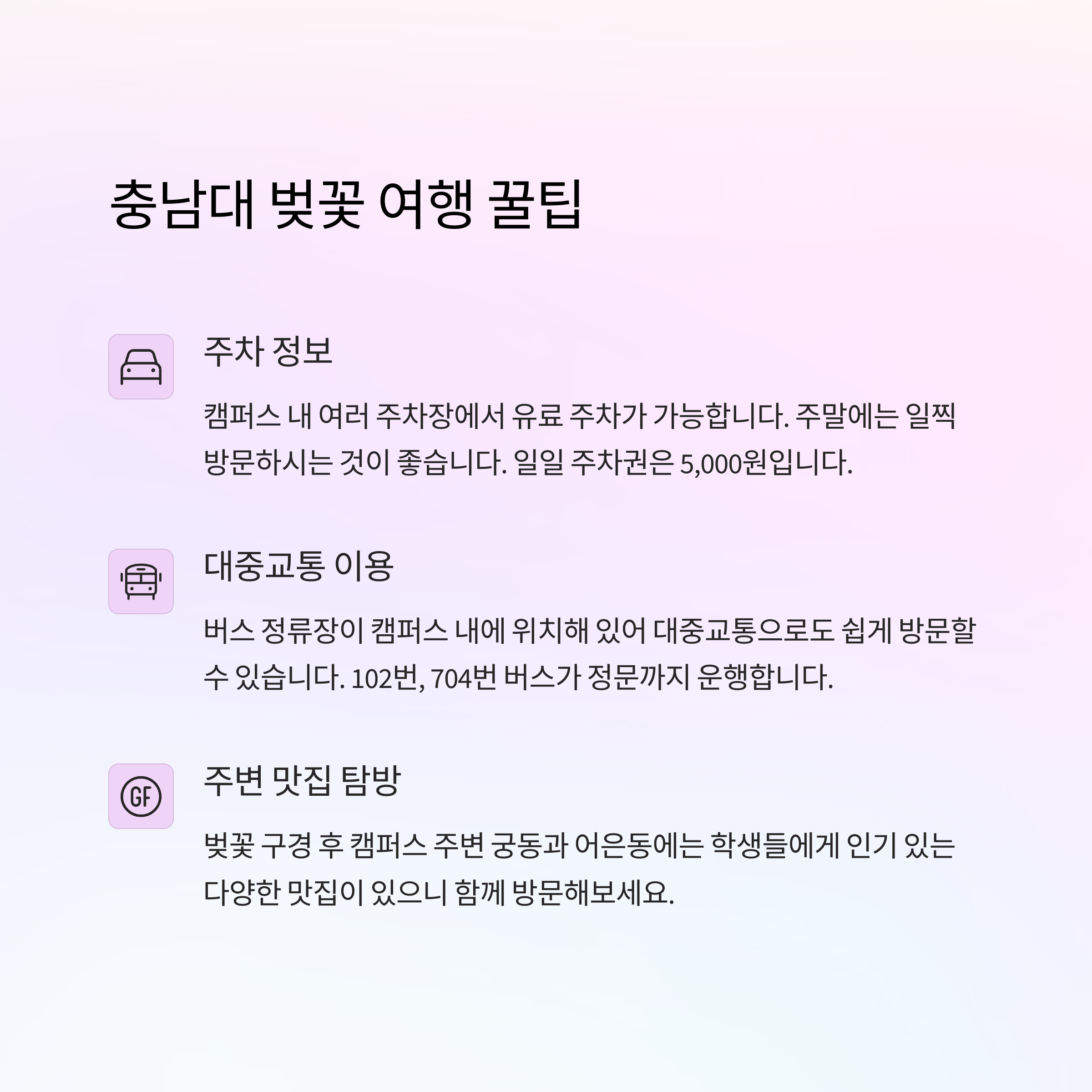 충남대학교 벚꽃길에 다녀오신 경험이나 추천하고 싶은 숨은 명소가 있다면 댓글로 알려주세요. 소중한 경험과 팁을 나누며 더 풍성한 봄나들이 계획을 함께 만들어가요!