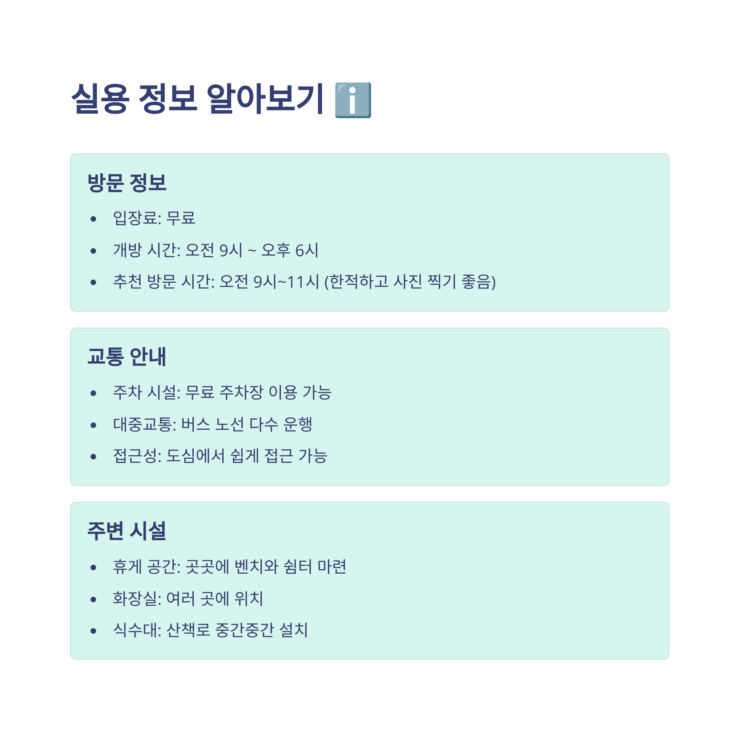 산책을 즐기는 분들을 위해 추천 코스를 안내드리자면, 동원 산책로는 튤립과 조팝나무가 어우러진 걷기 좋은 구간입니다. 열대식물원 앞의 포토존은 다양한 꽃들이 조화를 이뤄 인생샷을 남기기에 안성맞춤이며, 목련원은 고급스러운 분위기를 연출하기에 제격입니다. 오전 시간대에 방문하면 보다 여유로운 분위기 속에서 꽃들을 감상할 수 있고, 수목원 내 주차장은 마련되어 있으나 주말에는 대중교통 이용도 추천됩니다. 무엇보다 꽃을 보호하고, 자연을 아끼는 마음으로 관람해주시면 더욱 의미 있는 봄날 산책이 될 것입니다.