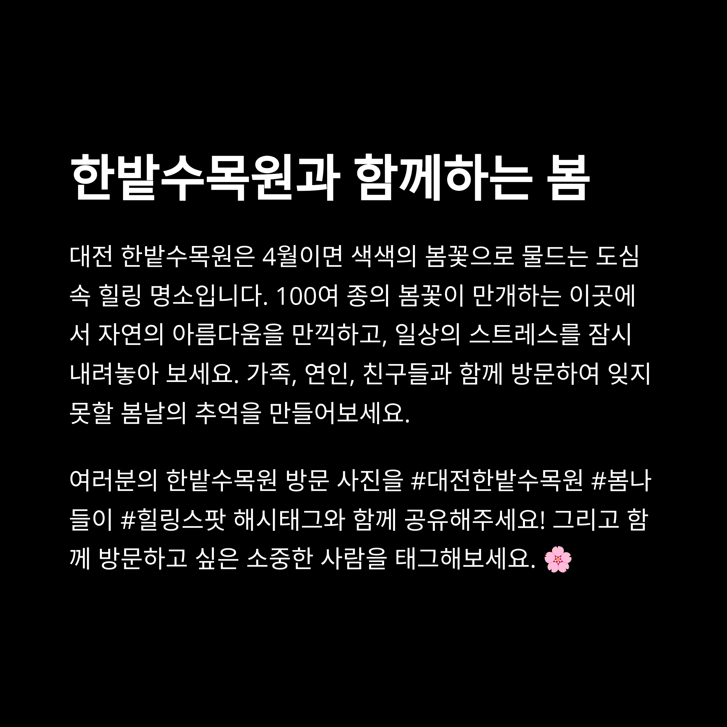 대전 한밭수목원에서 가장 인상 깊었던 꽃은 무엇이었나요? 사진이나 감상 후기를 댓글로 남겨주시면 다른 분들에게도 큰 도움이 됩니다. 함께 나누는 봄의 이야기, 기다릴게요!