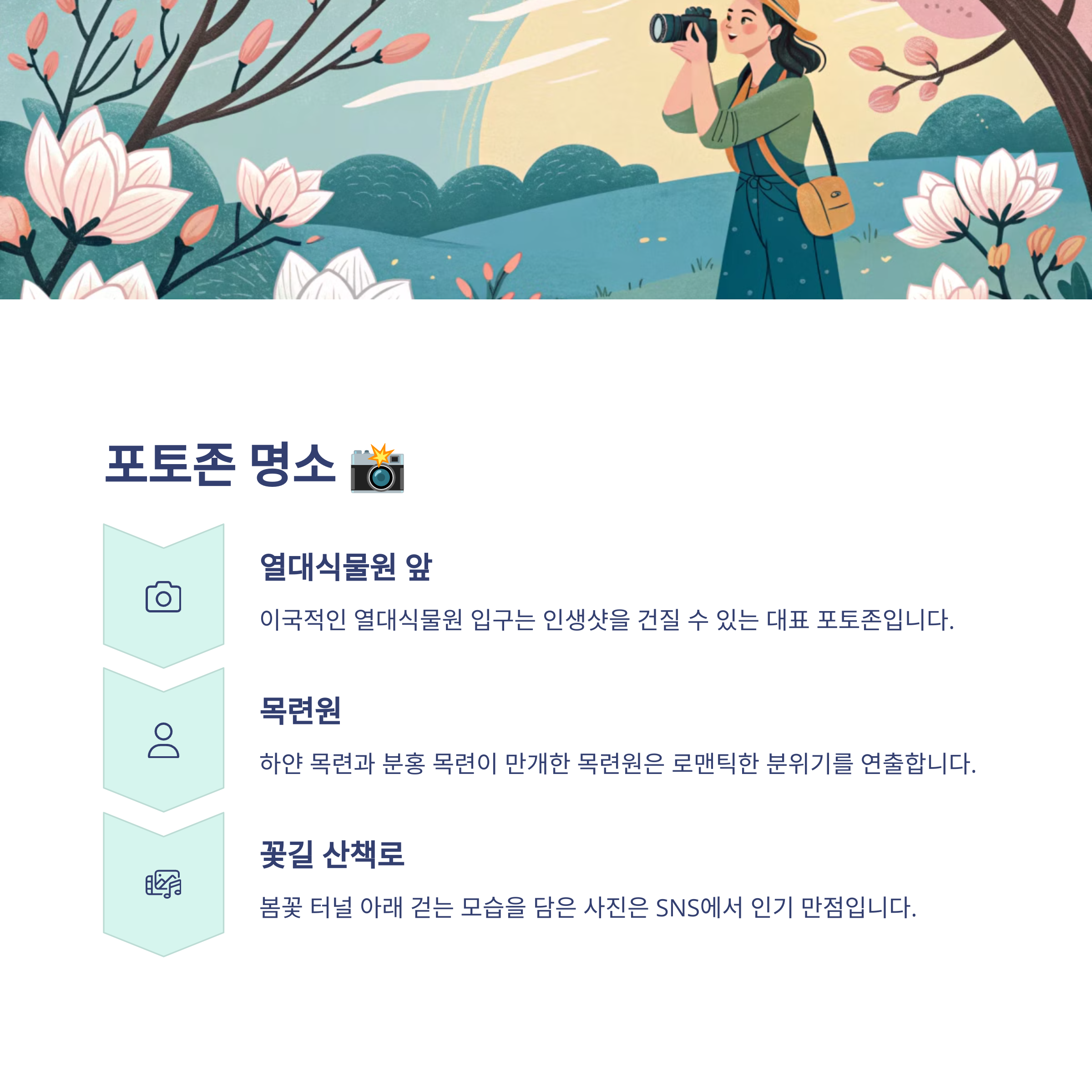 대표 봄꽃 | 추천 산책로 | 방문 팁 |