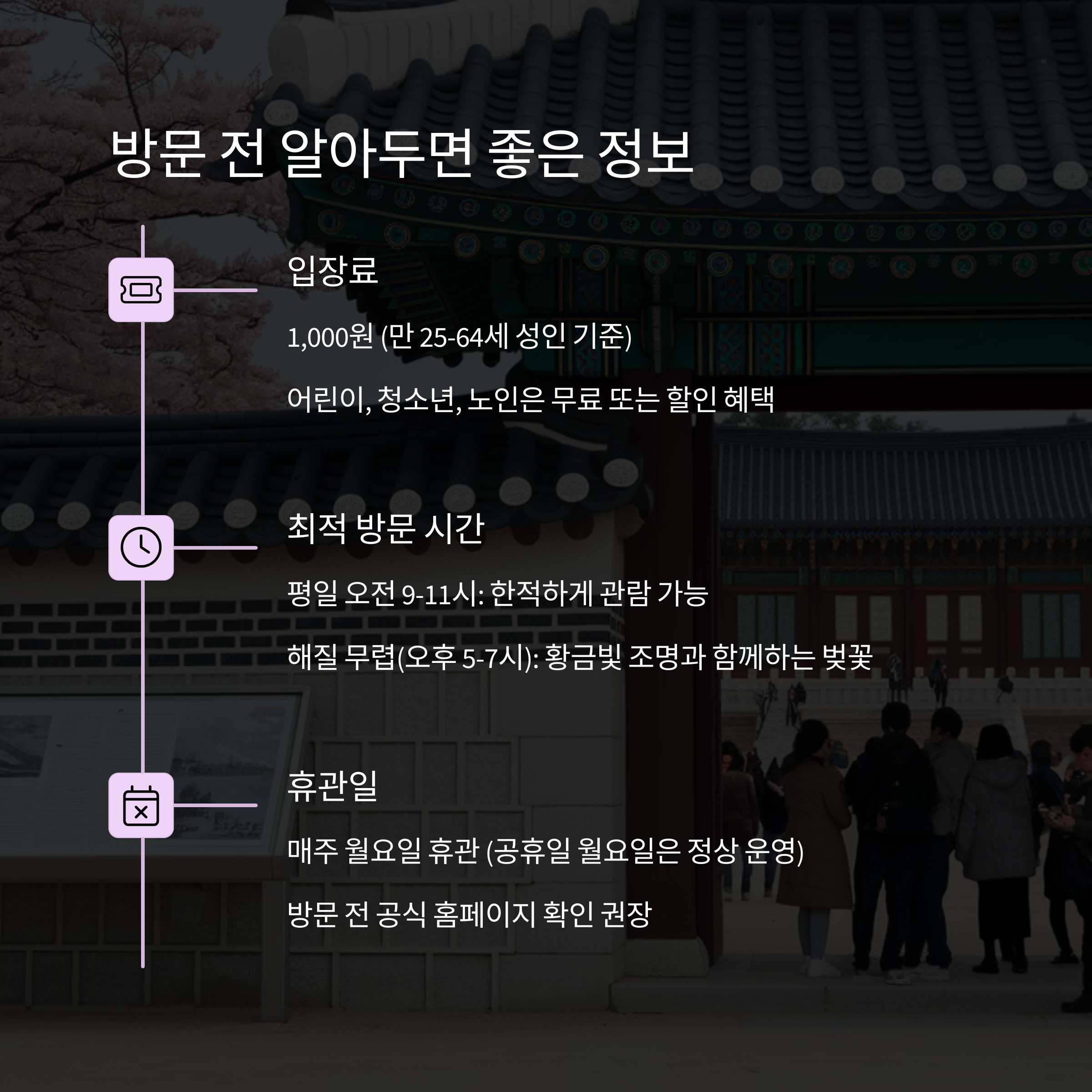 방문 시 평일 오전이나 노을지는 해질녘이 가장 여유롭습니다. 대중교통을 활용하면 주차 걱정 없이 이동이 가능하며, 편안한 복장을 갖춰 오래 걸어도 무리가 없습니다. 사진을 찍을 땐 자연광을 적극 활용해 보세요. 특히 벚꽃 가지를 배경 삼아 고궁의 지붕선을 함께 담으면 독특하고 분위기 있는 사진이 완성됩니다.