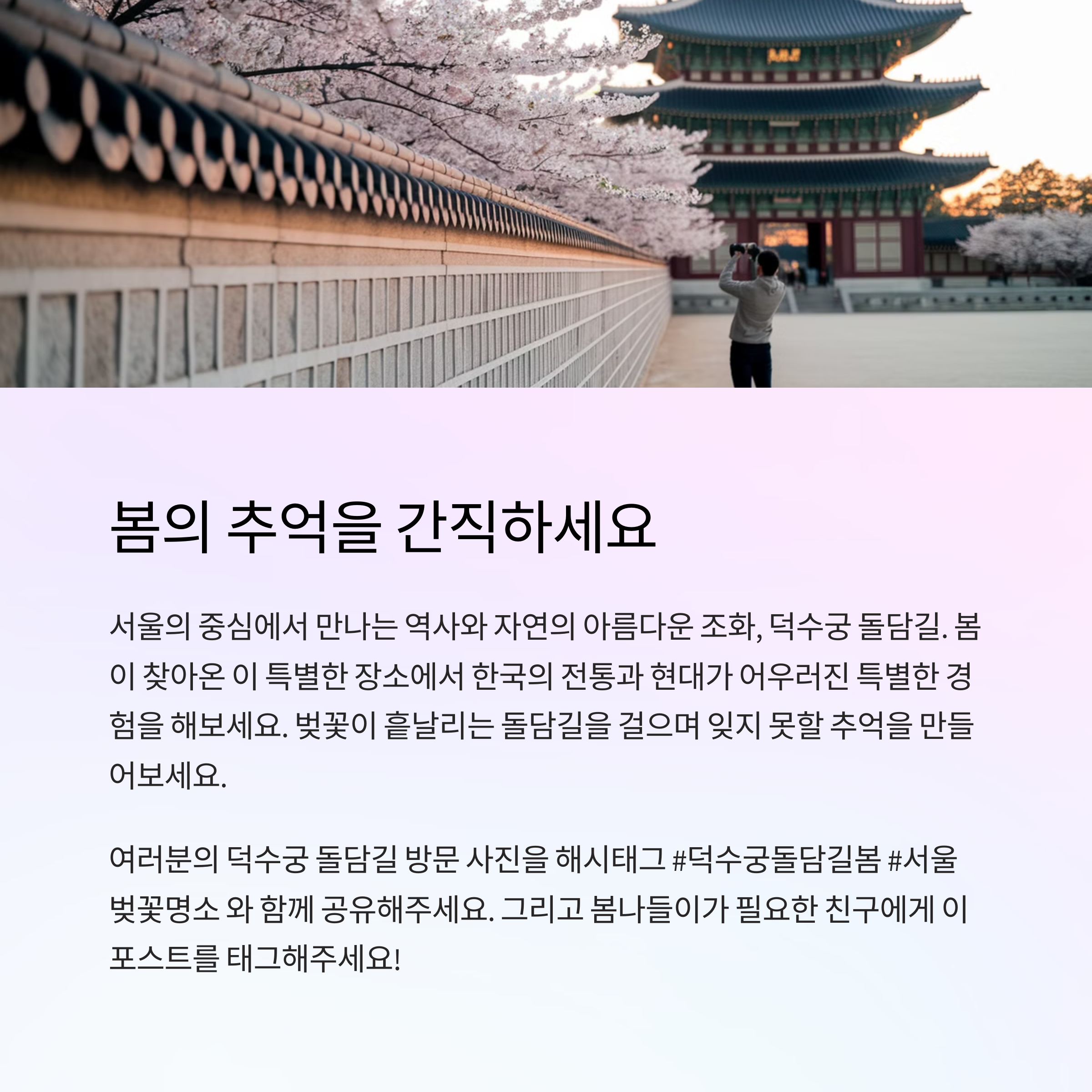 덕수궁 돌담길은 단순한 봄나들이 장소를 넘어서 역사와 자연, 그리고 도심의 여유가 조화롭게 어우러진 특별한 공간입니다. 벚꽃이 만개한 시기에는 사진 속에서만 보던 낭만적인 풍경이 펼쳐지고, 석조전과 고궁의 전각들이 배경이 되어 잊지 못할 봄날의 추억을 선사합니다. 여유롭게 걸으며 고궁과 벚꽃을 감상하고, 서울의 중심에서 문화와 감성을 동시에 경험할 수 있는 이곳. 덕수궁 돌담길에서 여러분도 소중한 봄을 담아보시길 바랍니다.