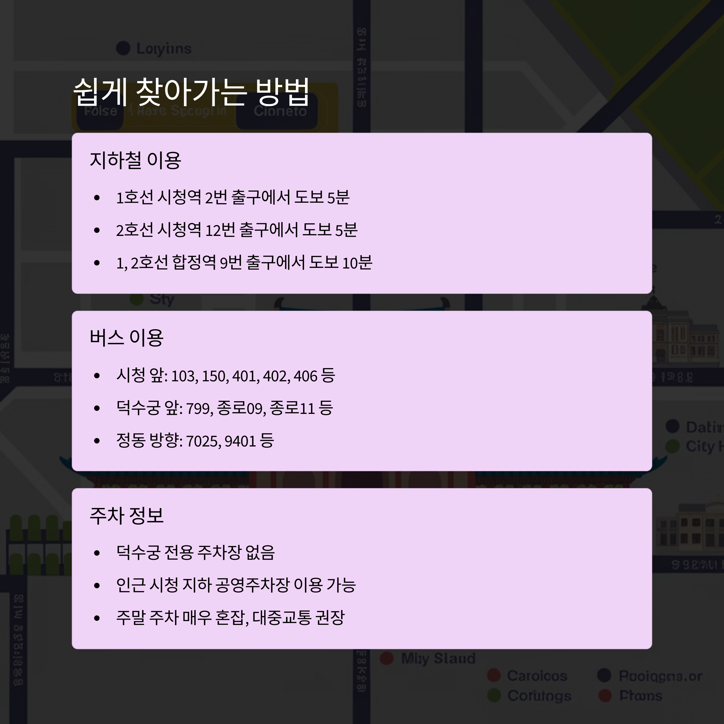 | 평일 오전, 해질 무렵 조용히 즐기기 좋아요. | 시청역 1호선 도보 5분, 대중교통이 최적 | 석조전 뒤편, 중화전 인근 포토존 추천 |