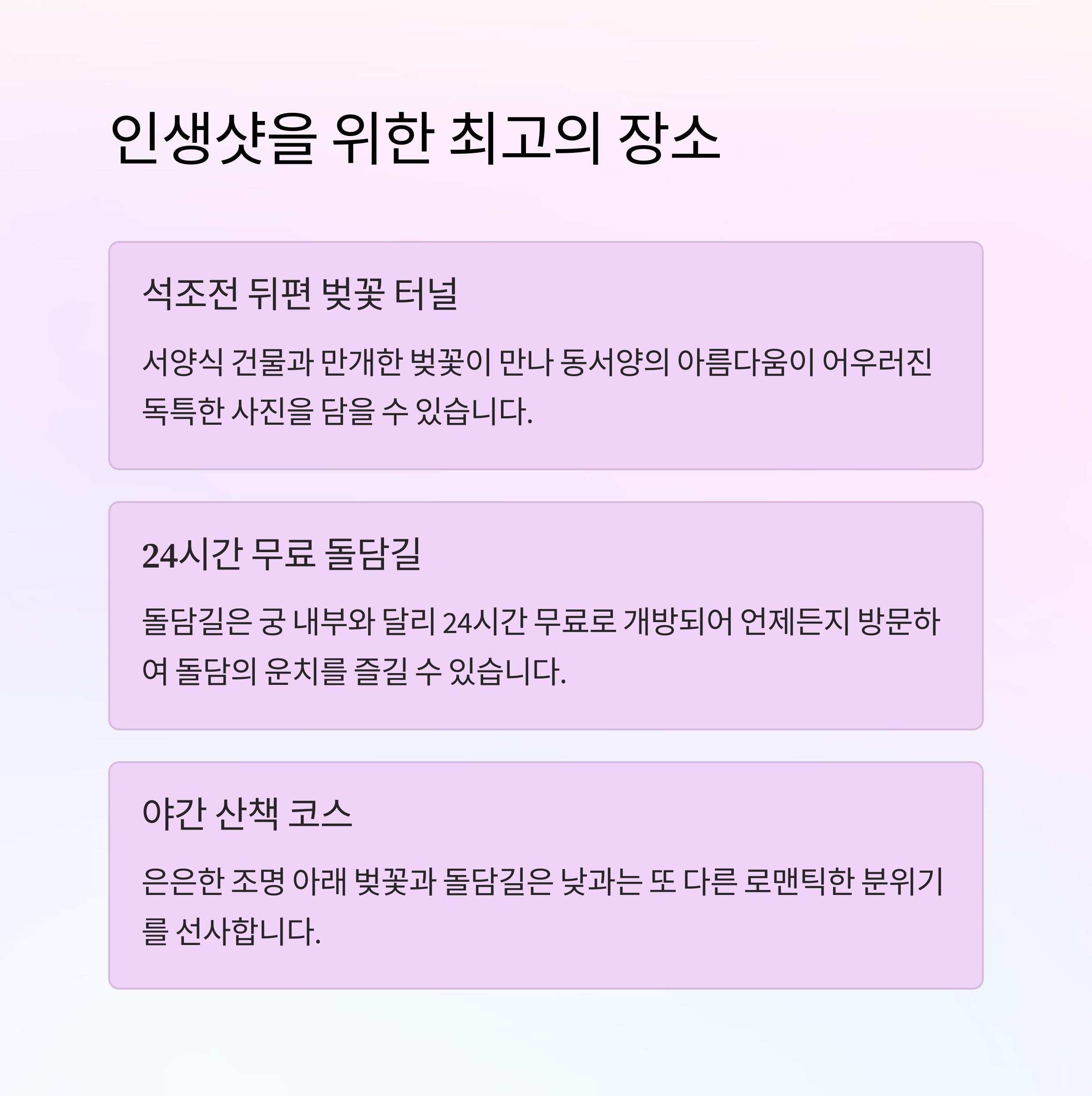 가장 추천하는 포토존은 석조전 뒤편입니다. 유럽풍의 석조건물과 수양벚꽃이 어우러진 그 풍경은 SNS에서도 인생샷 명소로 잘 알려져 있죠. 해질 무렵 노을과 함께 벚꽃을 배경으로 촬영하면 특별한 분위기를 연출할 수 있습니다. 또한 대한문 앞 광장은 넓은 공간 덕분에 웅장한 벚꽃 사진을 남기기에도 좋고, 중화전과 정관헌 사이 산책로는 고궁의 고요한 매력을 느끼며 여유롭게 걸을 수 있어 추천드립니다.