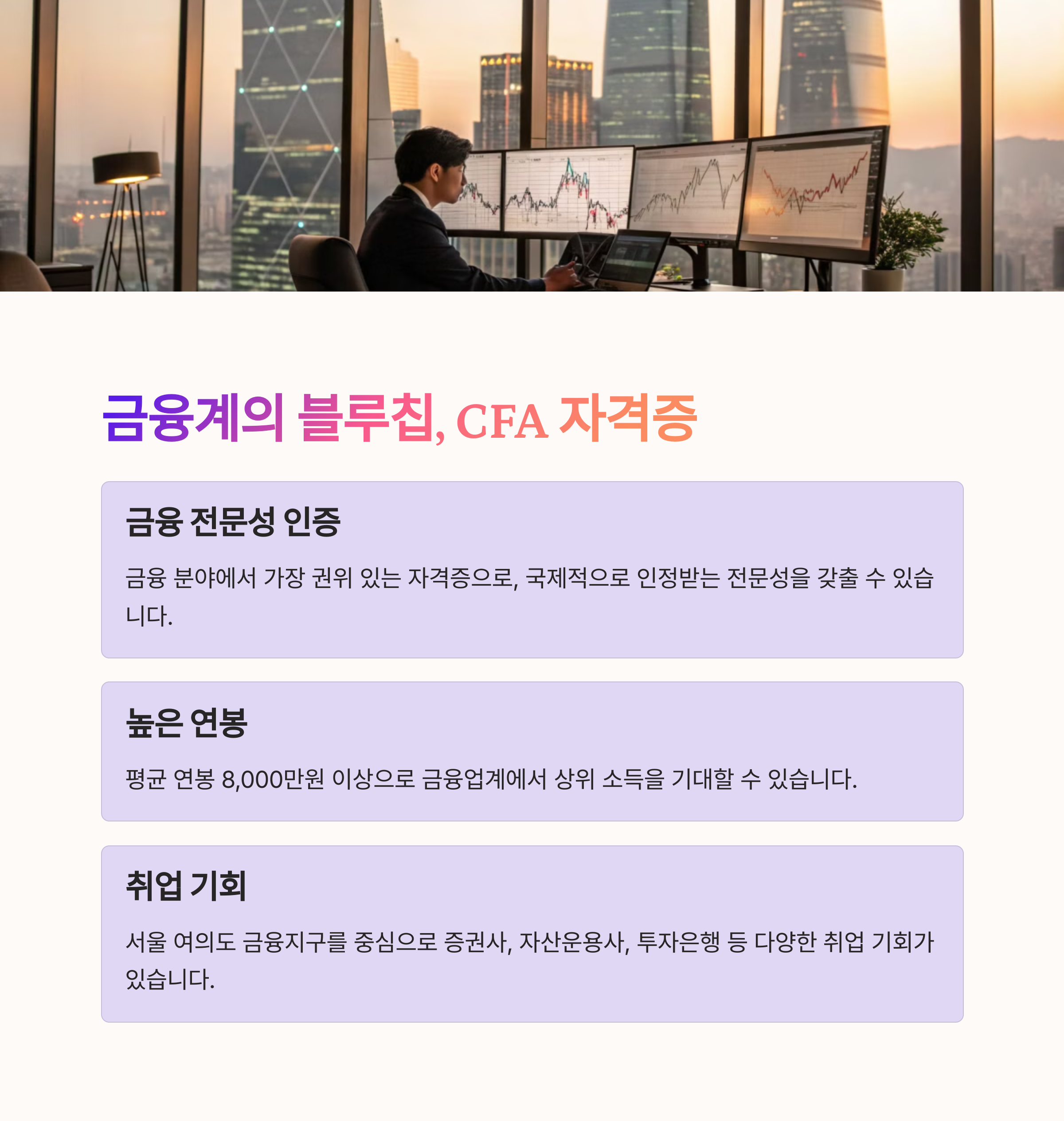 첫 번째로 소개할 자격증은 금융권에서 인정받는 CFA입니다. 높은 연봉과 성장 가능성으로 인해 많은 분들이 도전하고 있습니다.
