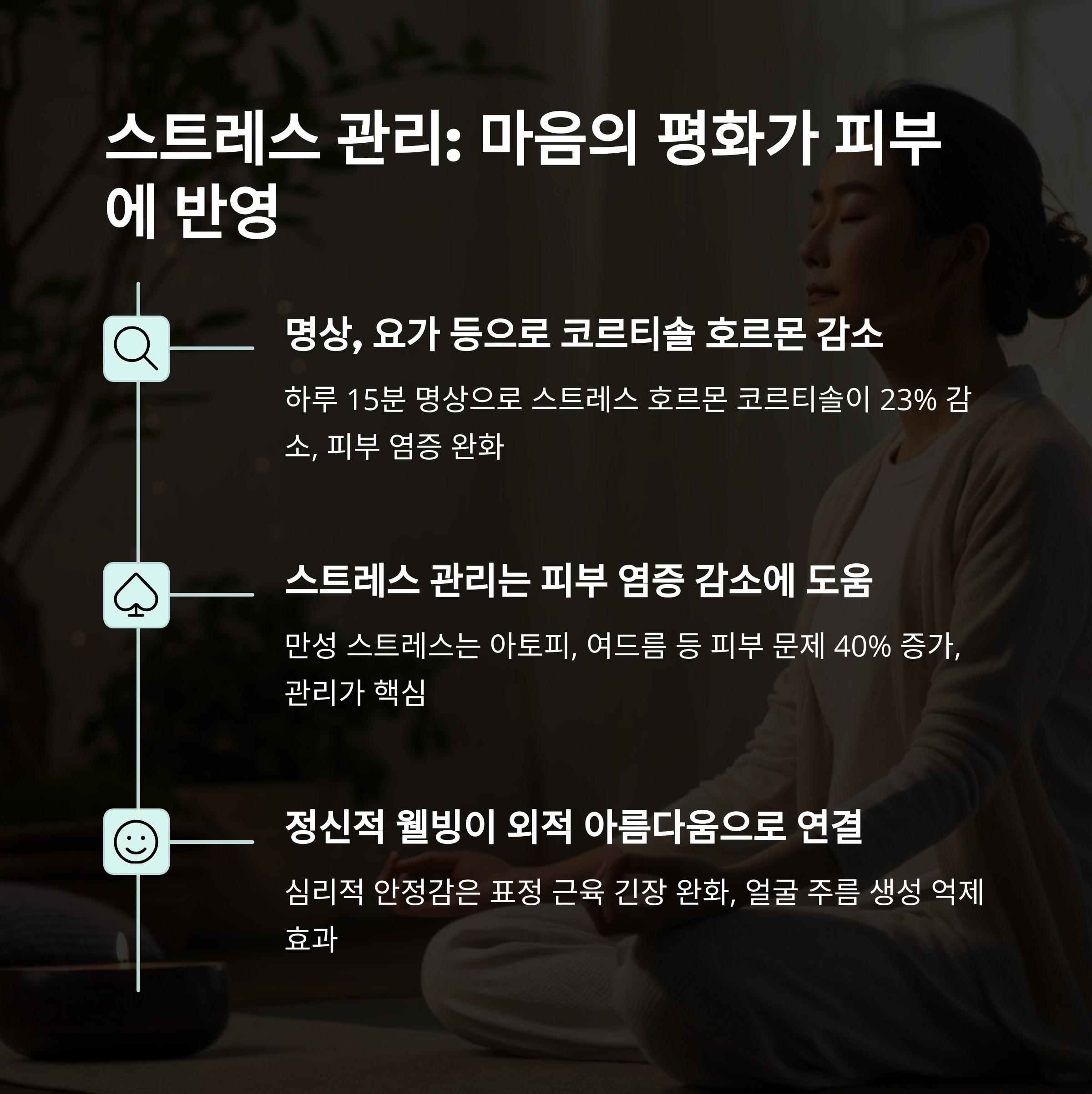 하루 8잔의 물은 피부 수분과 탄력을 유지합니다. 7~8시간 수면은 피부 회복과 컨디션에 중요합니다. 명상, 요가 등으로 스트레스를 완화할 수 있습니다.