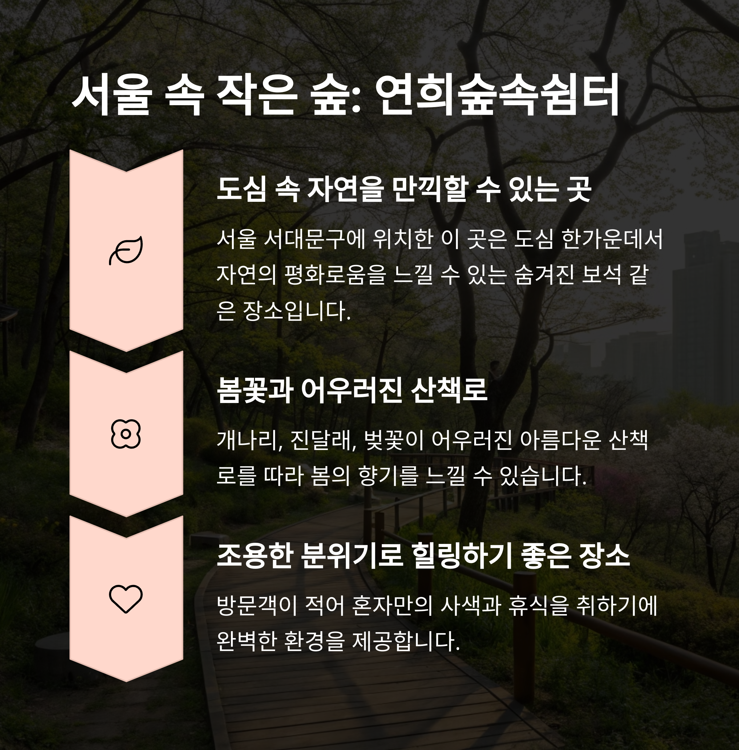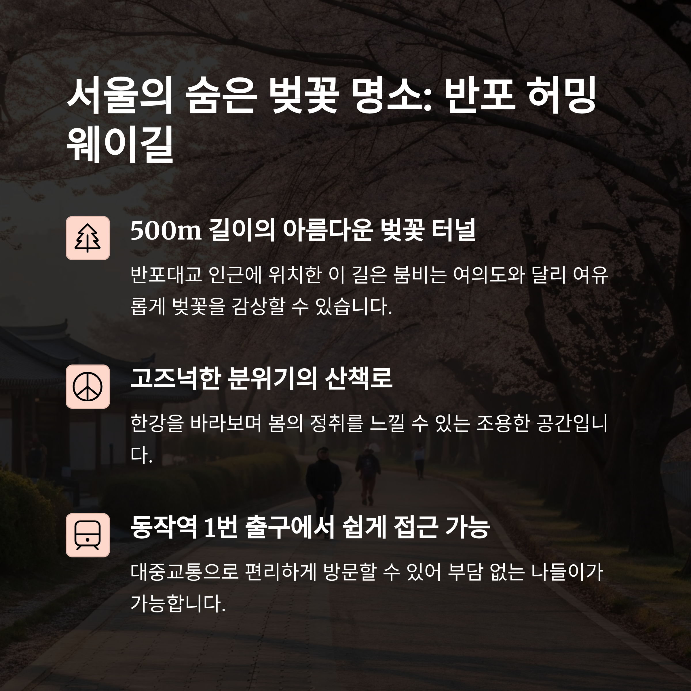 | 서울 도림천, 연희숲속쉼터 등 조용한 명소 | 정독도서관, 마이산 등 감성 데이트 코스 | 반포 허밍웨이길, 구로 둑방길 등 벚꽃길 |
