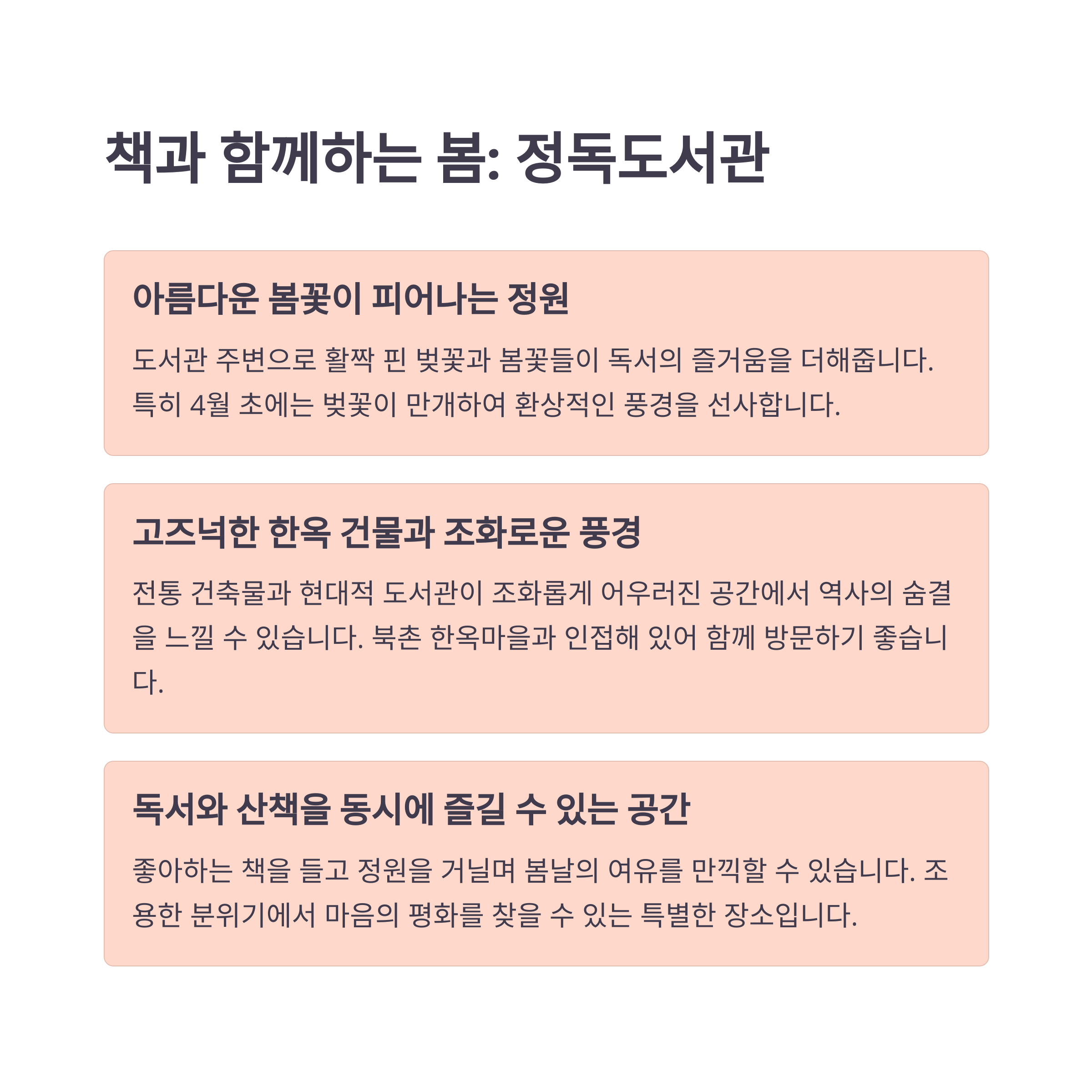 | 봄 추천 활동 | 산책, 벚꽃 감상, 커피 타임 등 조용한 힐링 제안 |