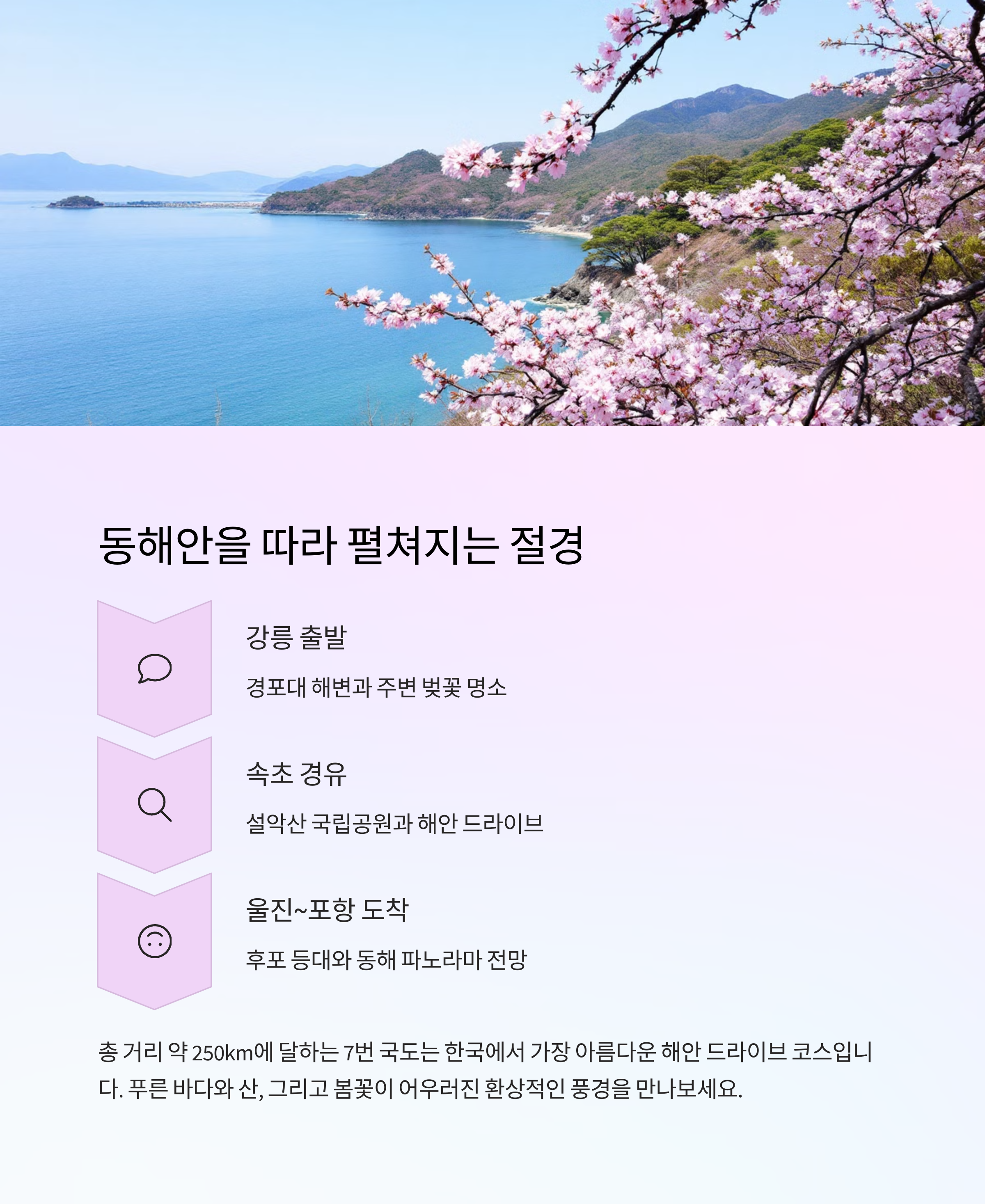 특히 봄에는 동해안을 따라 달리는 벚꽃길이 환상적이니, 이 시기를 놓치지 마세요.