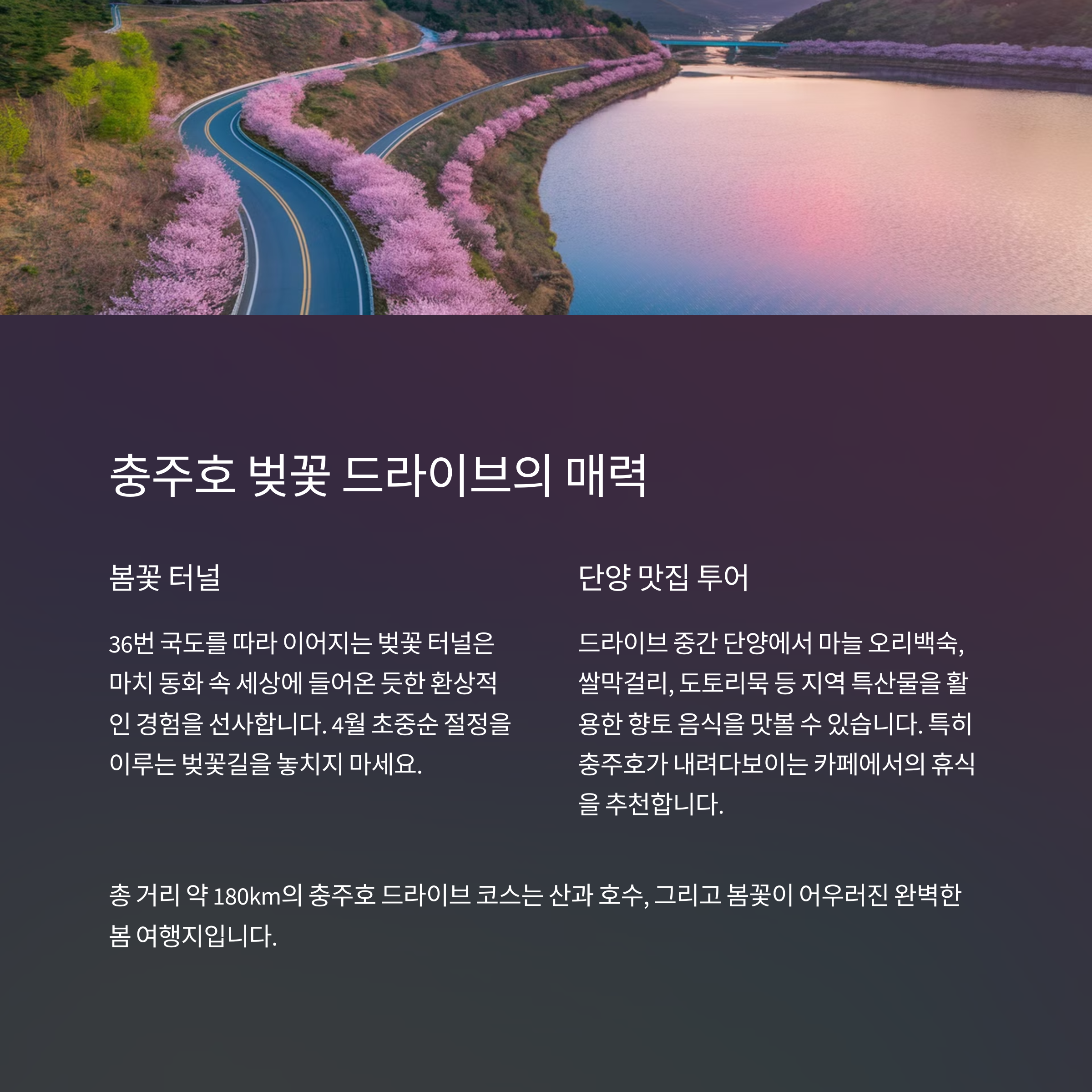 2. 충주호 드라이브 코스는 벚꽃과 단풍으로 유명한 경로입니다.