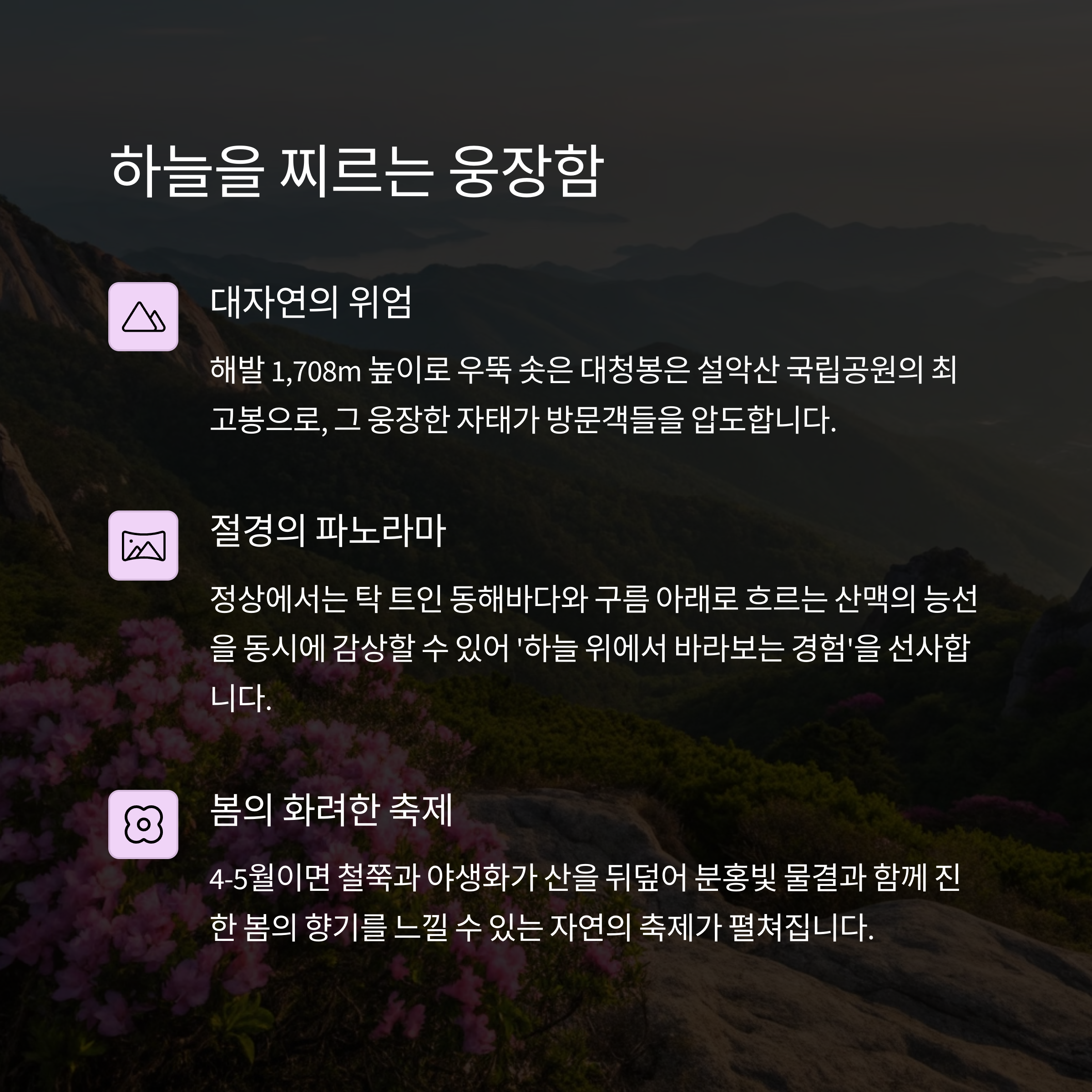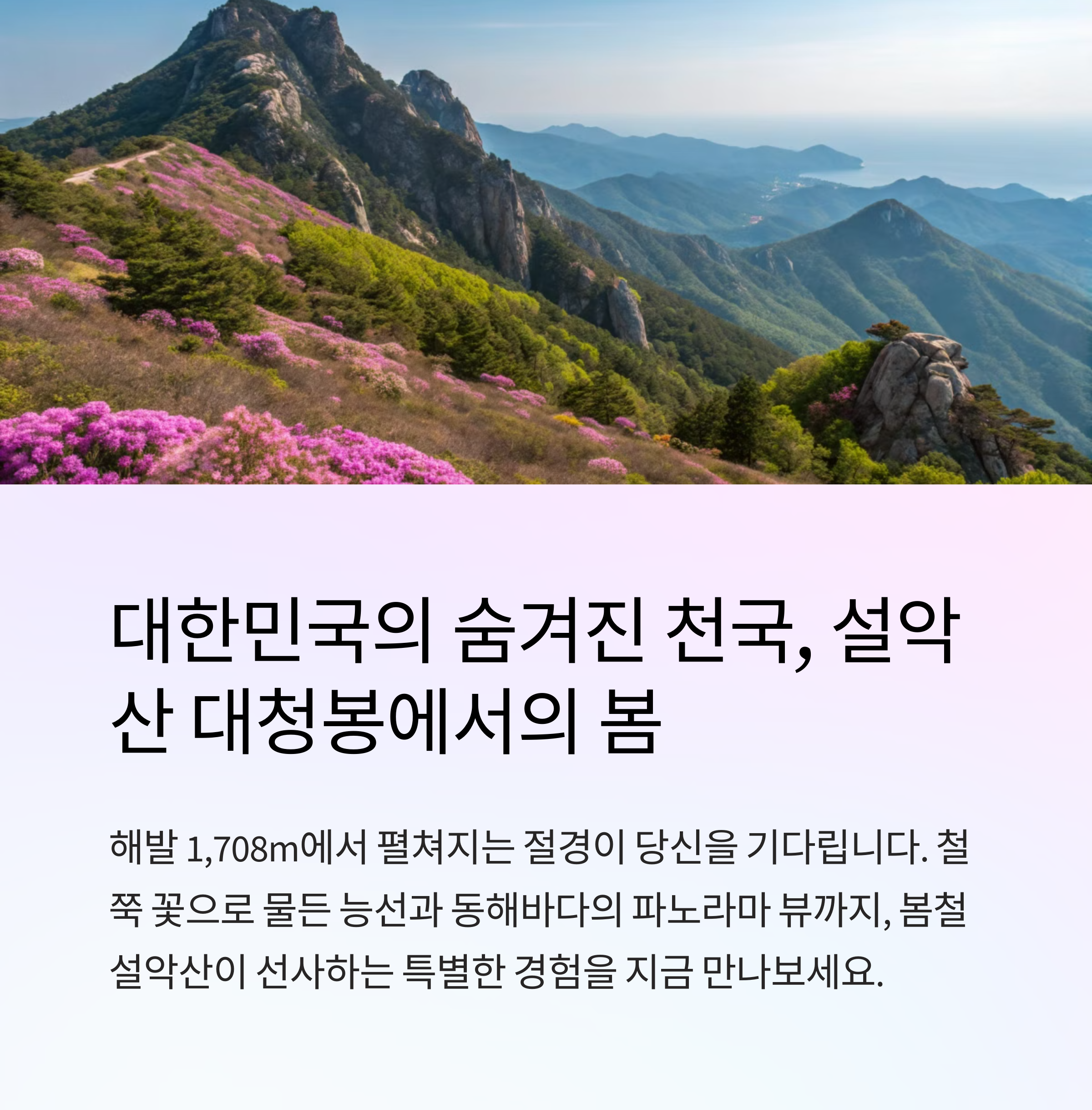 | 대청봉의 매력 | 철쭉과 동해바다 풍경이 어우러진 봄철 절경 |