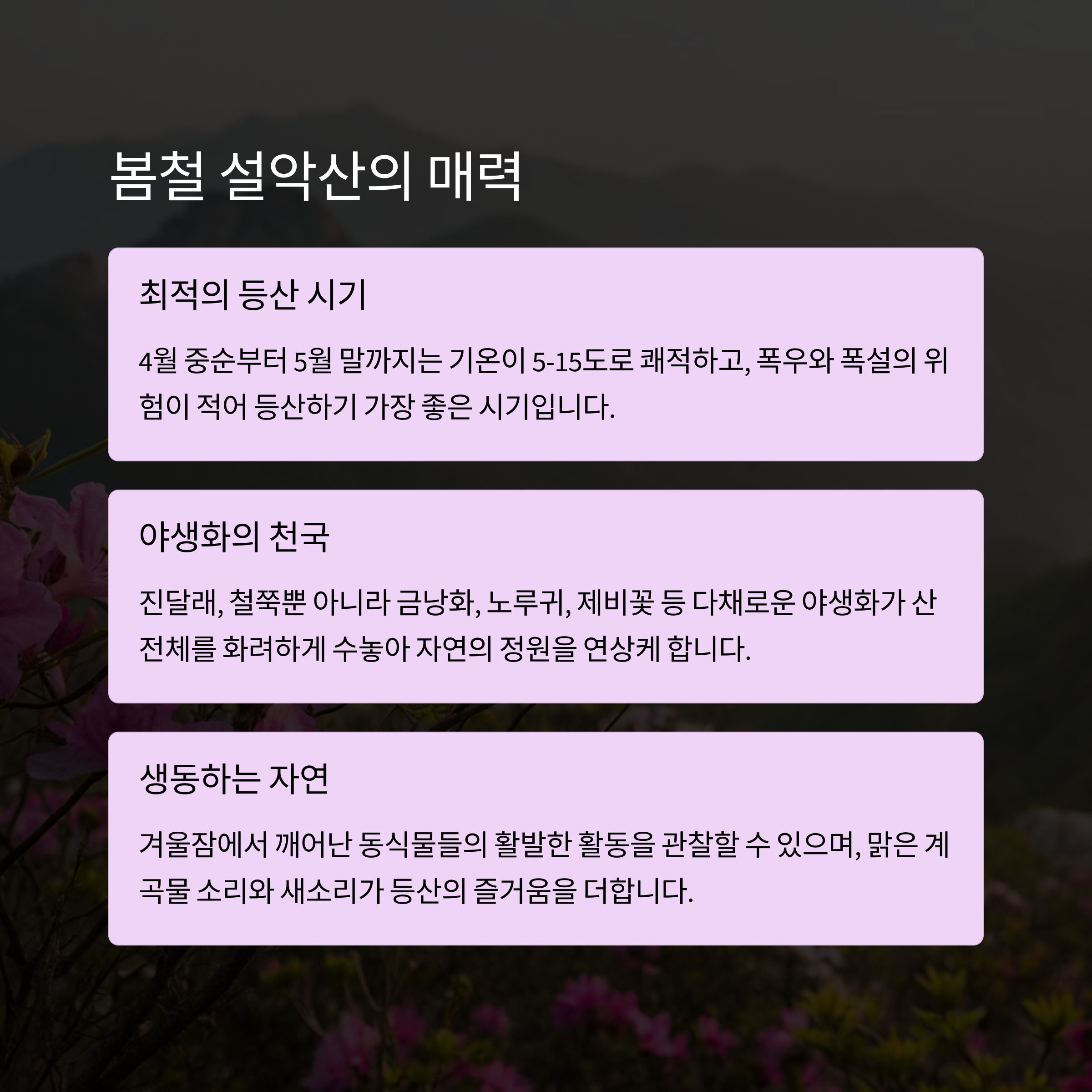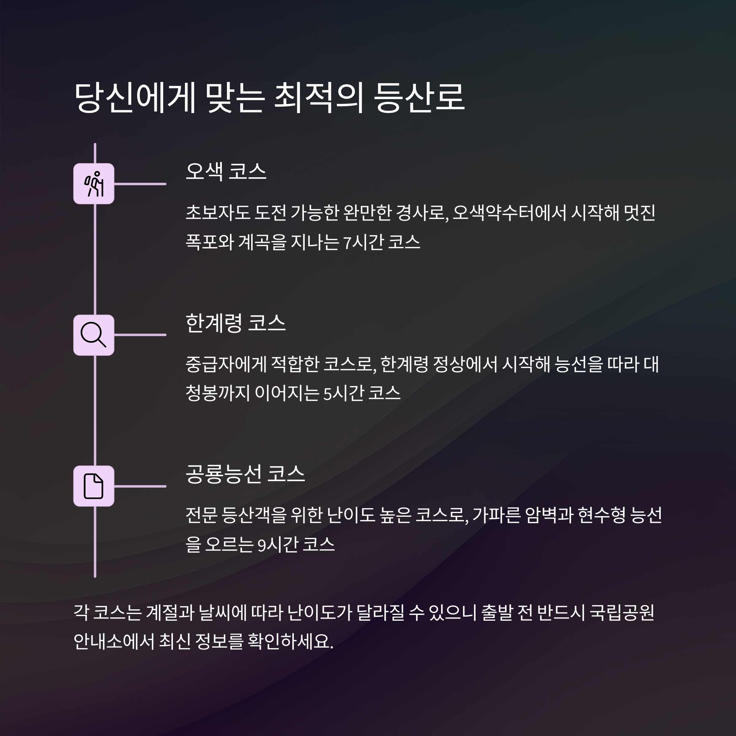 | 야생화와 함께 풍경이 화려해집니다. | 체력과 일정에 맞게 선택하세요. | 기온 변화에 대비한 복장도 필요합니다. |