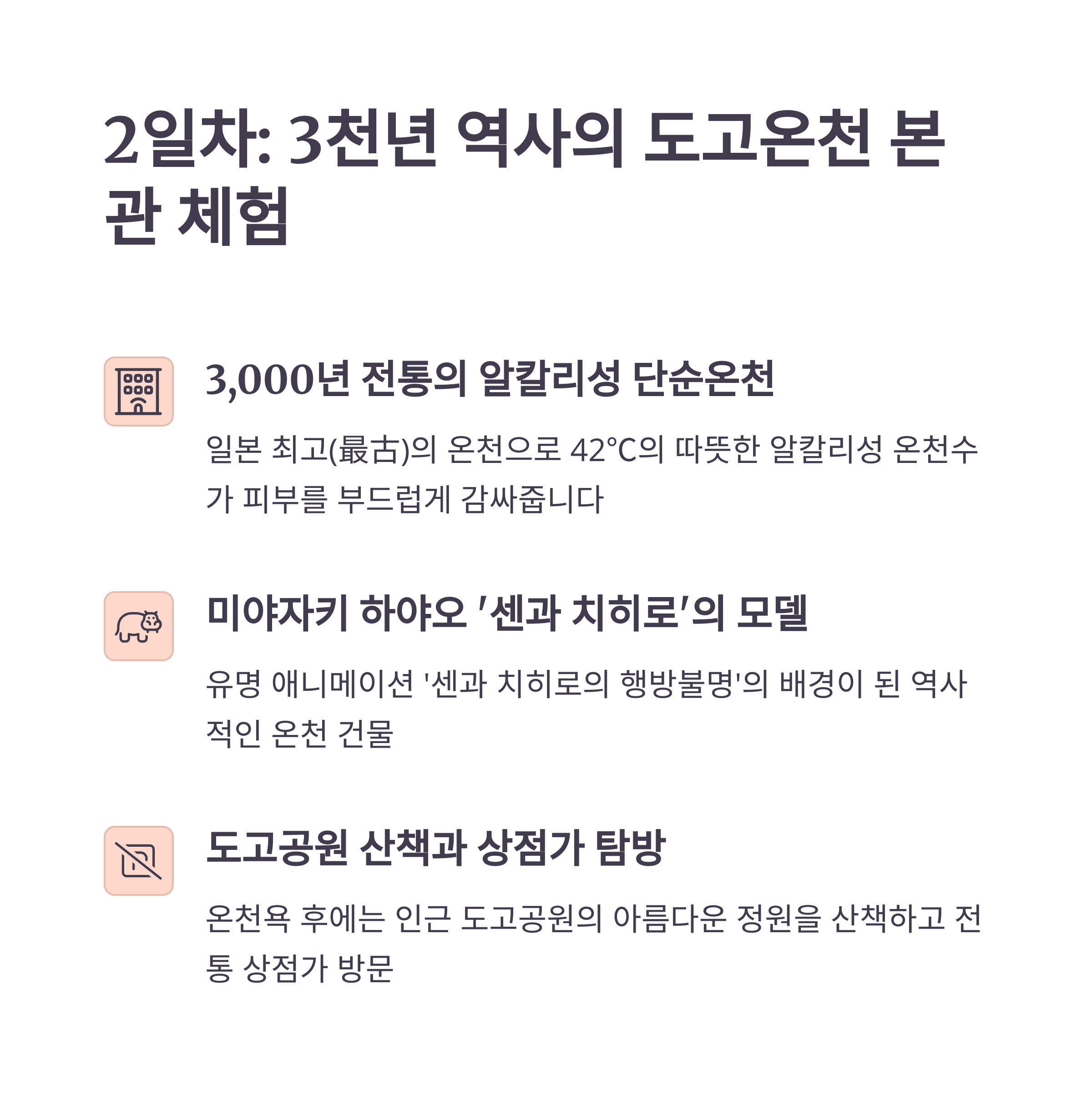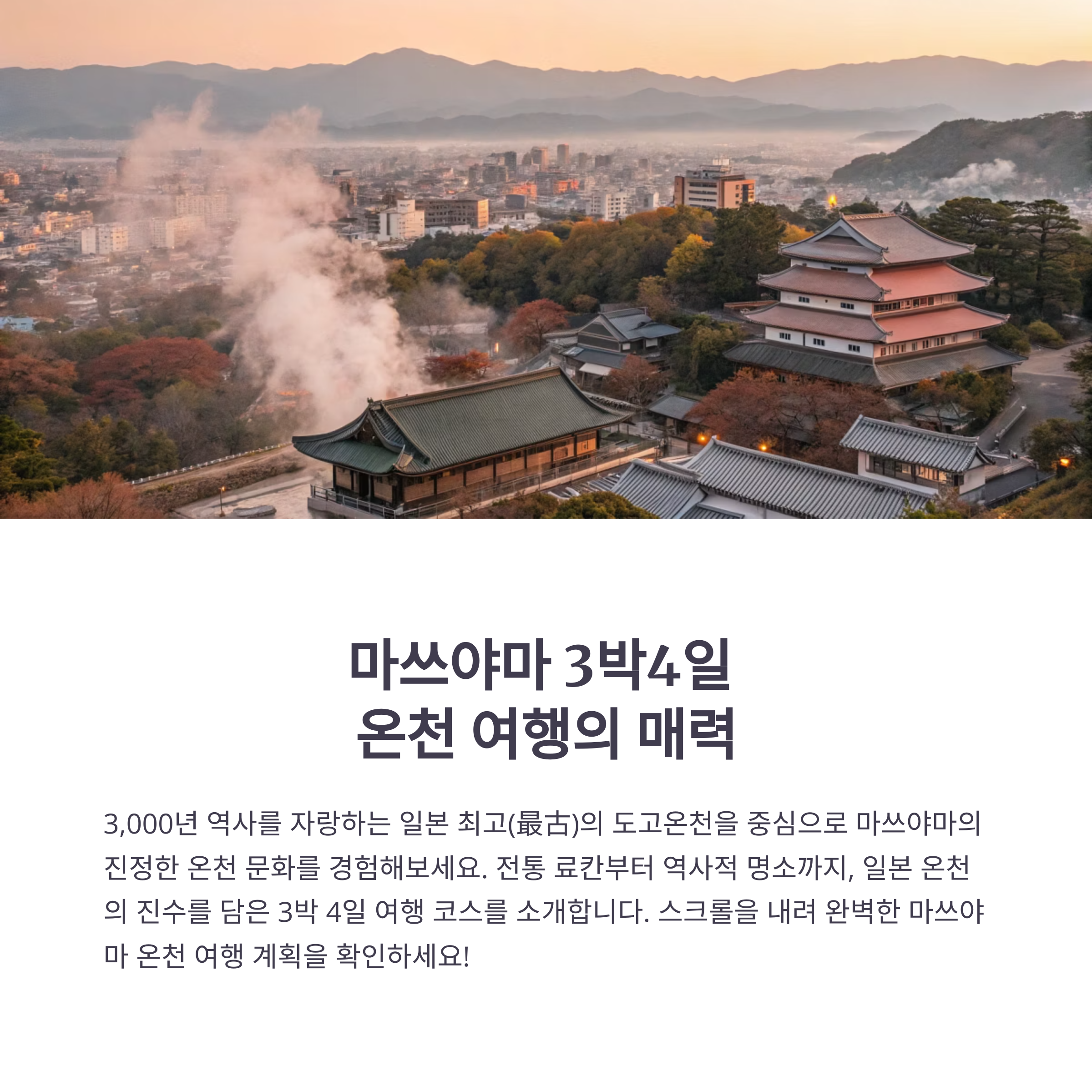 온천 체험 뿐만 아니라 마쓰야마성, 현지 미식, 계절 풍경 체험 등도 꼭 놓치지 않으셔야 합니다.