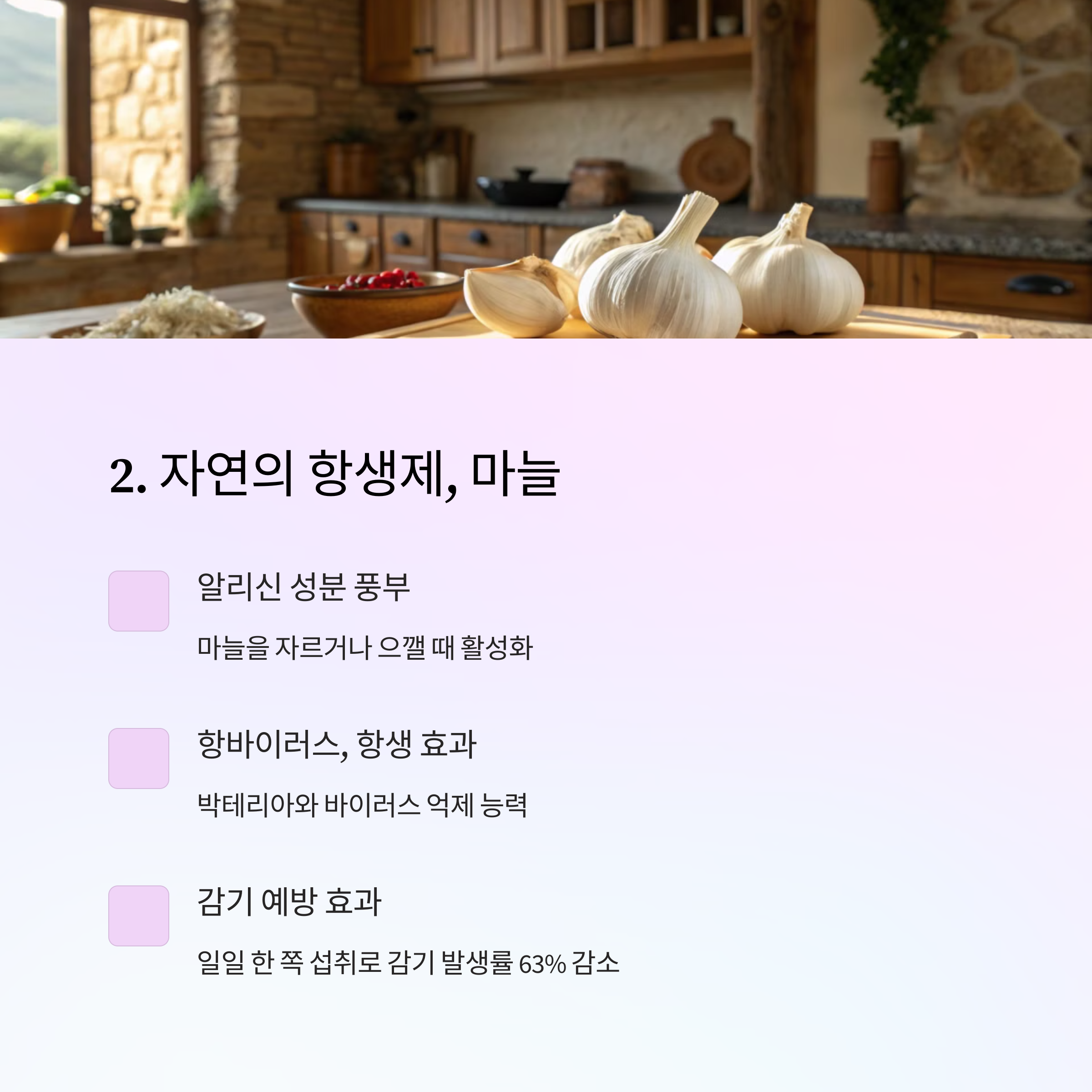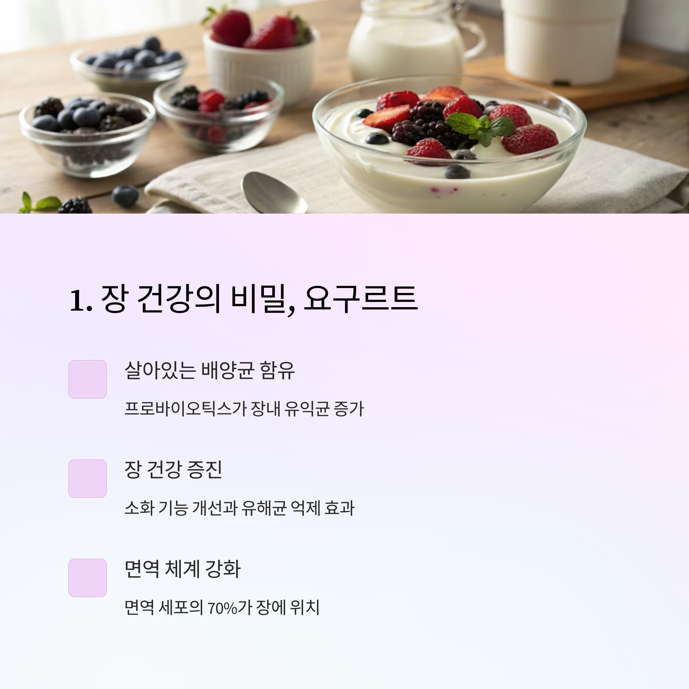 면역력은 우리 몸을 질병으로부터 지켜주는 첫 번째 방어선입니다. 그렇기 때문에 매일의 식단에 어떤 식품을 포함시키는지는 매우 중요합니다. 장 건강에 도움을 주는 요구르트는 대표적인 면역 강화 식품으로, 살아있는 유산균이 장내 환경을 개선하고 면역 세포의 활성을 도와줍니다. 또한 마늘에는 알리신이라는 항균 성분이 풍부해 감기 예방에 효과적입니다. 이처럼 일상적인 재료들이 우리 건강에 커다란 영향을 미친다는 점에서, 식단 구성의 중요성은 아무리 강조해도 지나치지 않습니다. 특히 자연에서 얻은 건강한 식품들은 몸속 깊은 곳부터 면역력을 높이는 데 큰 역할을 합니다.