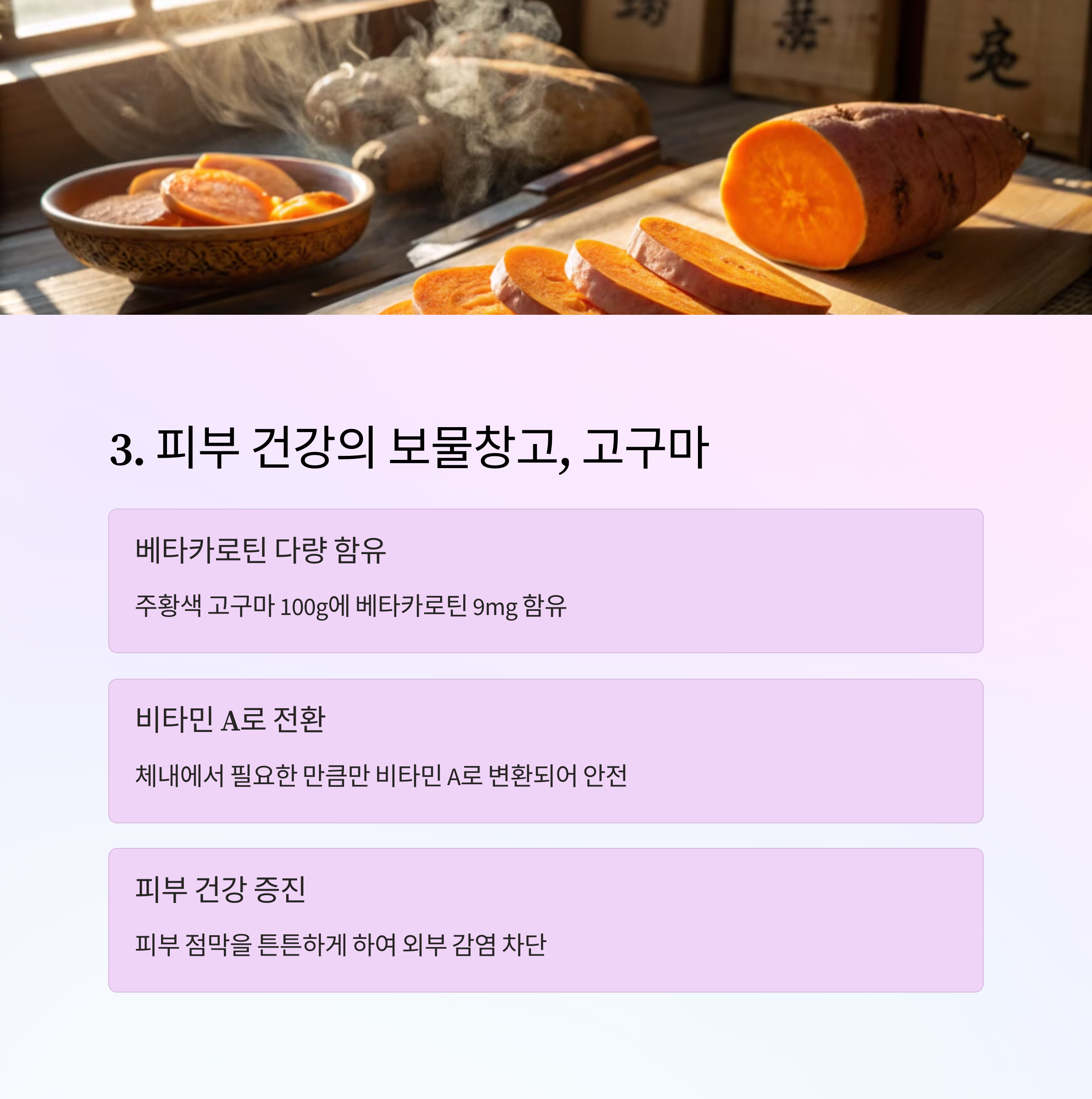 또 다른 면역력 강화 식품으로는 고구마와 버섯이 있습니다. 고구마는 풍부한 베타카로틴을 함유하고 있어 피부 건강을 증진시키고, 피부를 통한 병원체의 침입을 막아주는 역할을 합니다. 버섯은 백혈구의 활동을 활발하게 만들어 바이러스나 세균에 대한 저항력을 강화시킵니다. 또한 생선에 함유된 오메가-3 지방산은 면역 세포의 기능을 강화하고 염증 반응을 줄이는 데 효과적입니다. 매일 식단에 이런 식품들을 포함하면, 별도의 보충제 없이도 몸을 건강하게 유지할 수 있습니다.