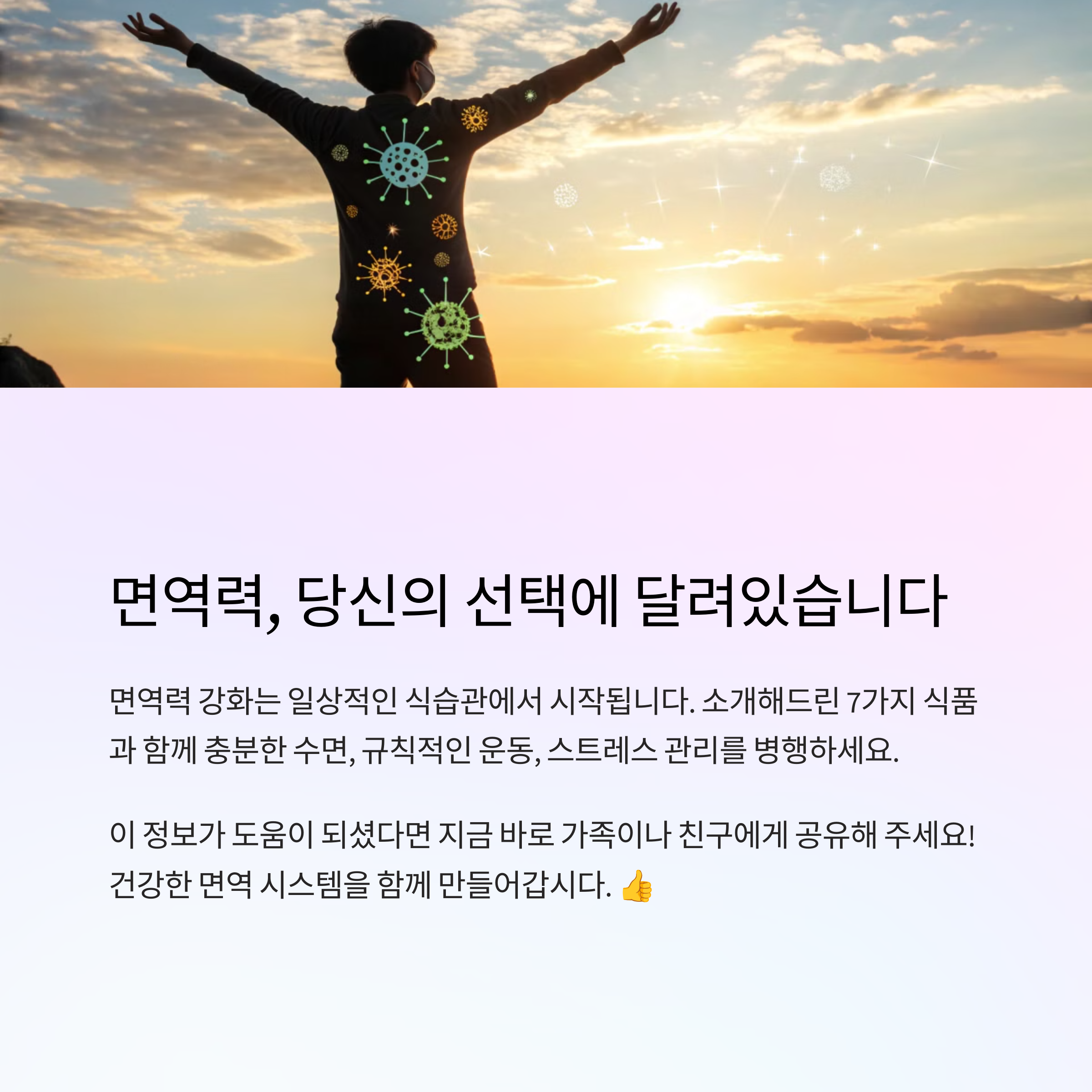오늘 소개해드린 면역력 강화 식품 7가지는 바쁜 현대인의 건강을 지키는 데 꼭 필요한 구성입니다. 특별한 약이나 보충제가 아니더라도 자연 속 식품을 통해 건강한 면역 체계를 유지할 수 있다는 점에서 일상 속 식단은 매우 중요한 역할을 합니다. 식사는 단순한 영양 공급을 넘어 우리의 몸을 보호하고 에너지를 채우는 과정입니다. 매일 조금씩 건강한 식품을 선택하고 실천하는 습관이 결국 건강한 삶으로 이어지게 됩니다. 오늘부터라도 내 식단을 돌아보고 면역력 강화 식품을 한 가지씩 추가해보는 건 어떨까요? 작은 변화가 큰 건강을 만들어줍니다.
