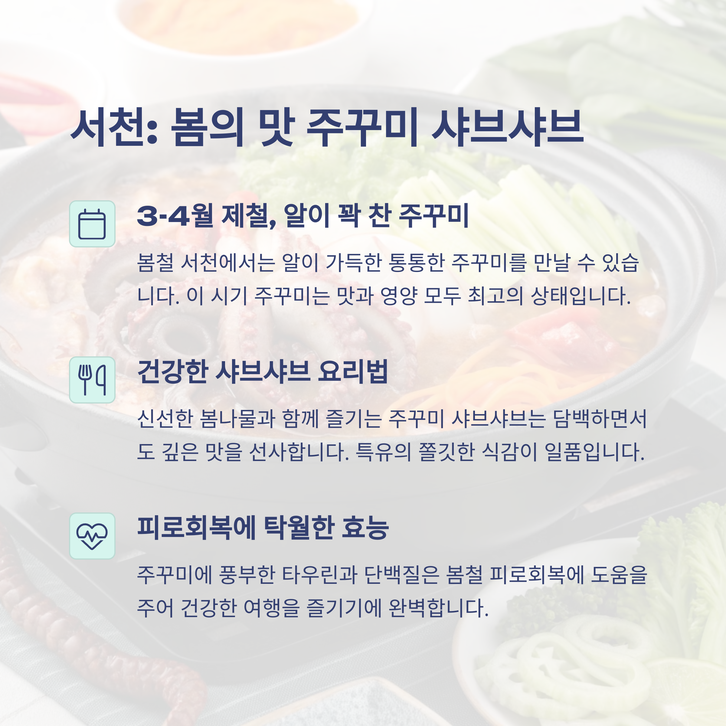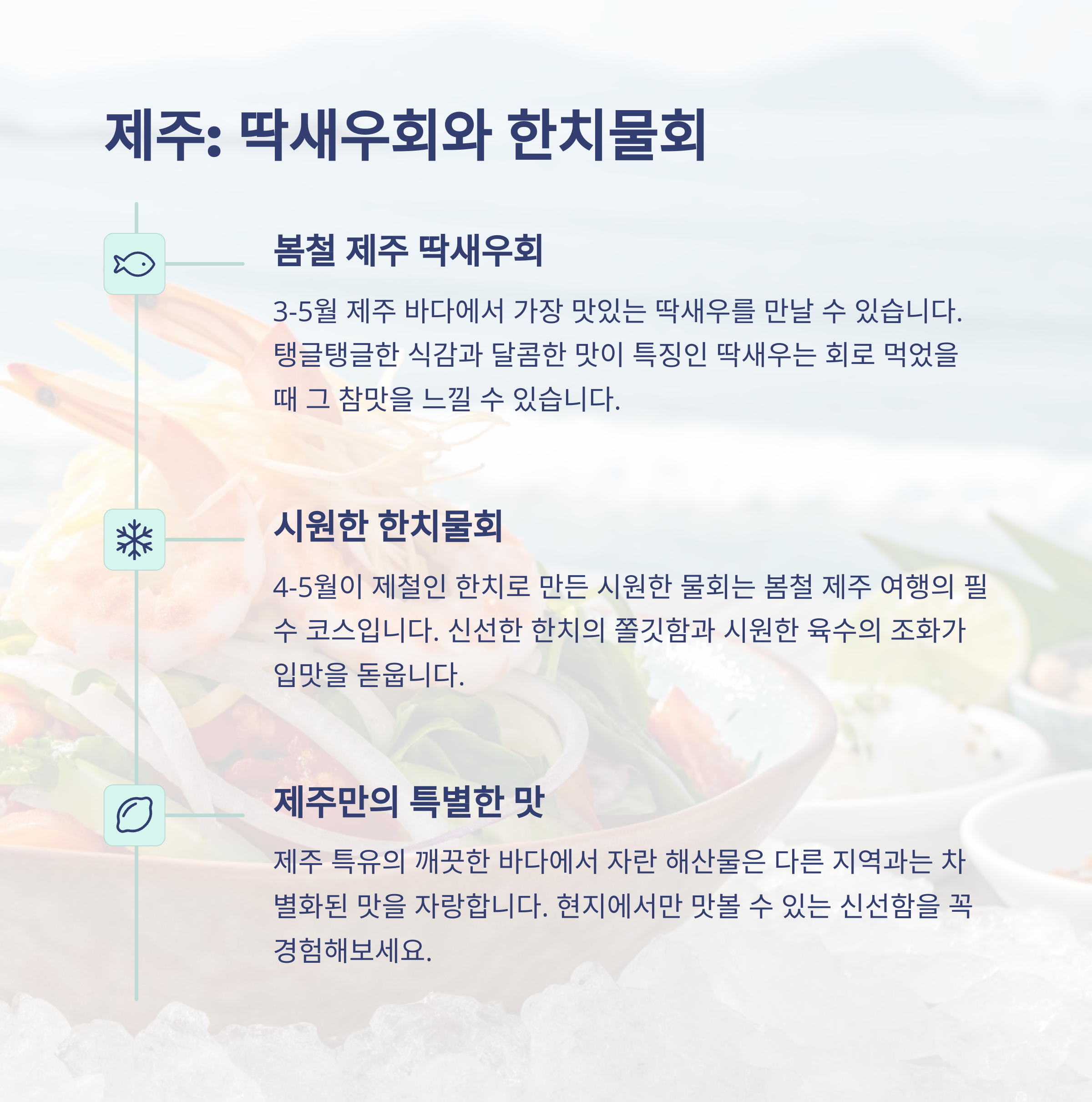 | 봄철 제철 식재료 | 도다리, 주꾸미, 딱새우, 대게 등 영양 가득한 재료 |