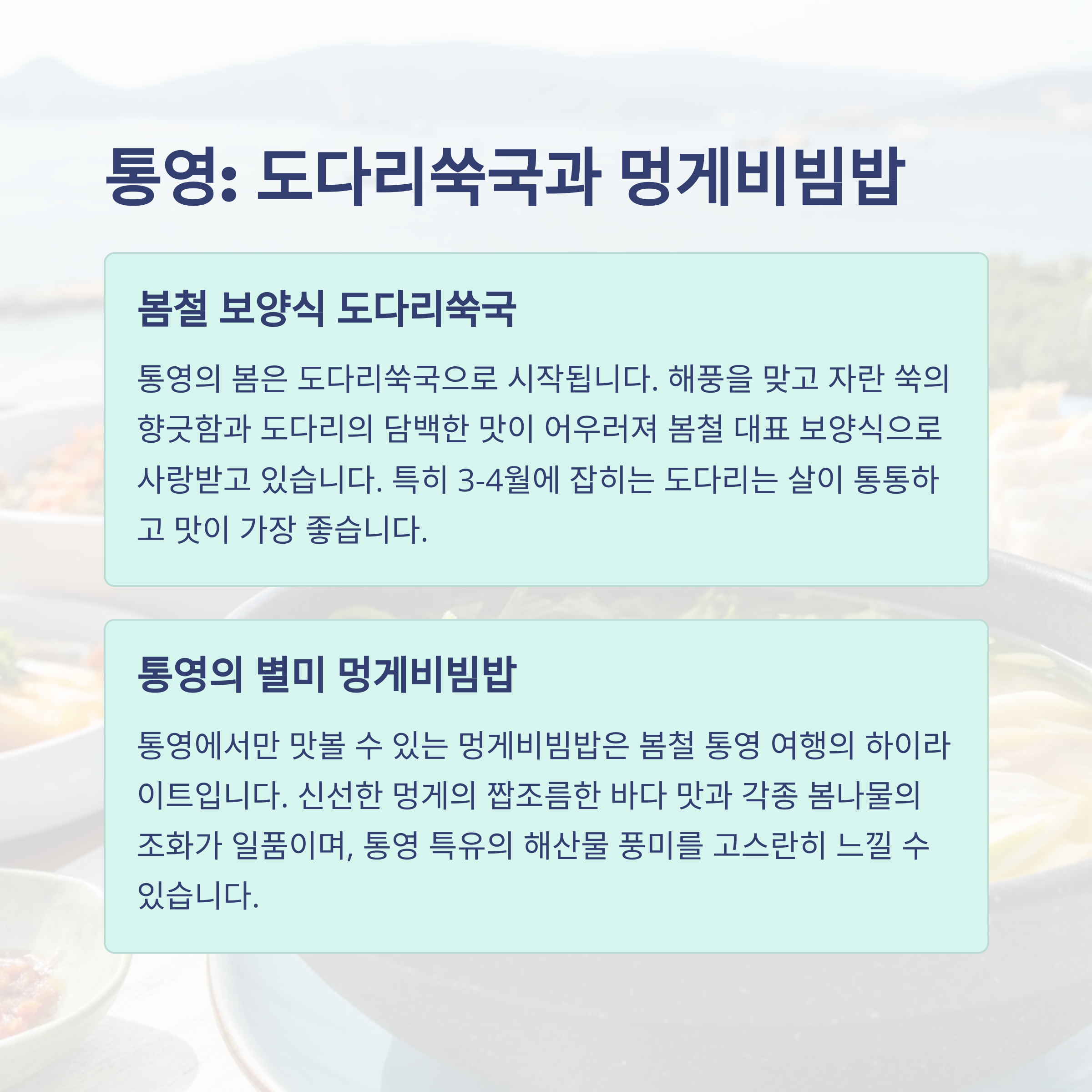 충남 서천에서는 주꾸미 샤브샤브와 볶음이 대표 음식으로 많은 관광객들의 발길을 이끌고 있습니다. 살짝 데친 주꾸미는 감칠맛이 살아있으며, 남은 육수에 칼국수를 넣어 먹는 구성은 한 끼 식사의 완성도를 높여줍니다. 경남 통영은 봄철 대표 보양식인 도다리쑥국으로 유명합니다. 향긋한 쑥과 담백한 도다리가 어우러진 국물은 속을 편하게 해주는 데 제격입니다. 또, 멍게비빔밥은 바다향 가득한 맛의 풍미로 입맛을 사로잡습니다.
