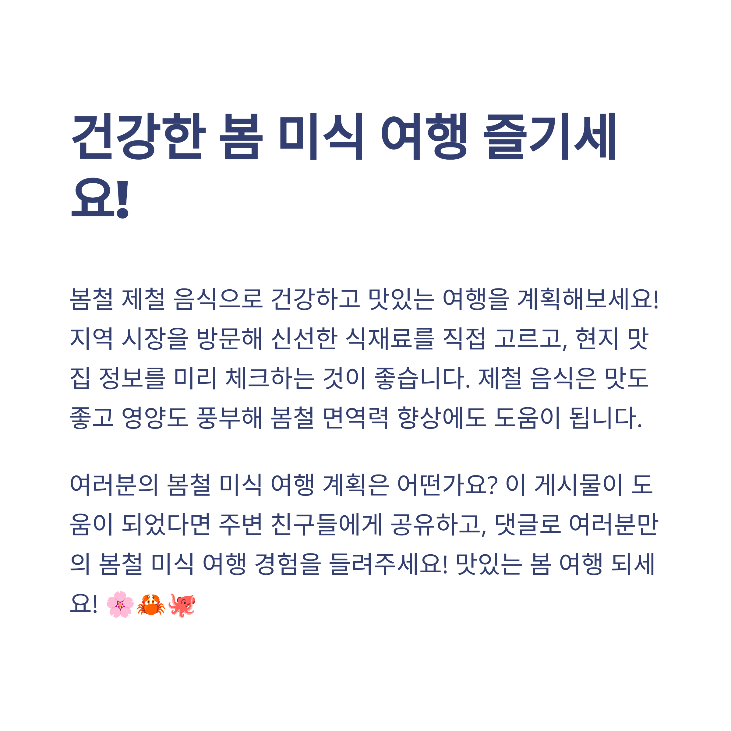 여러분이 방문한 봄철 미식 여행지는 어디인가요? 기억에 남는 제철 음식이 있다면 댓글로 나눠주세요. 함께 공유하면 더 풍성한 정보가 됩니다!