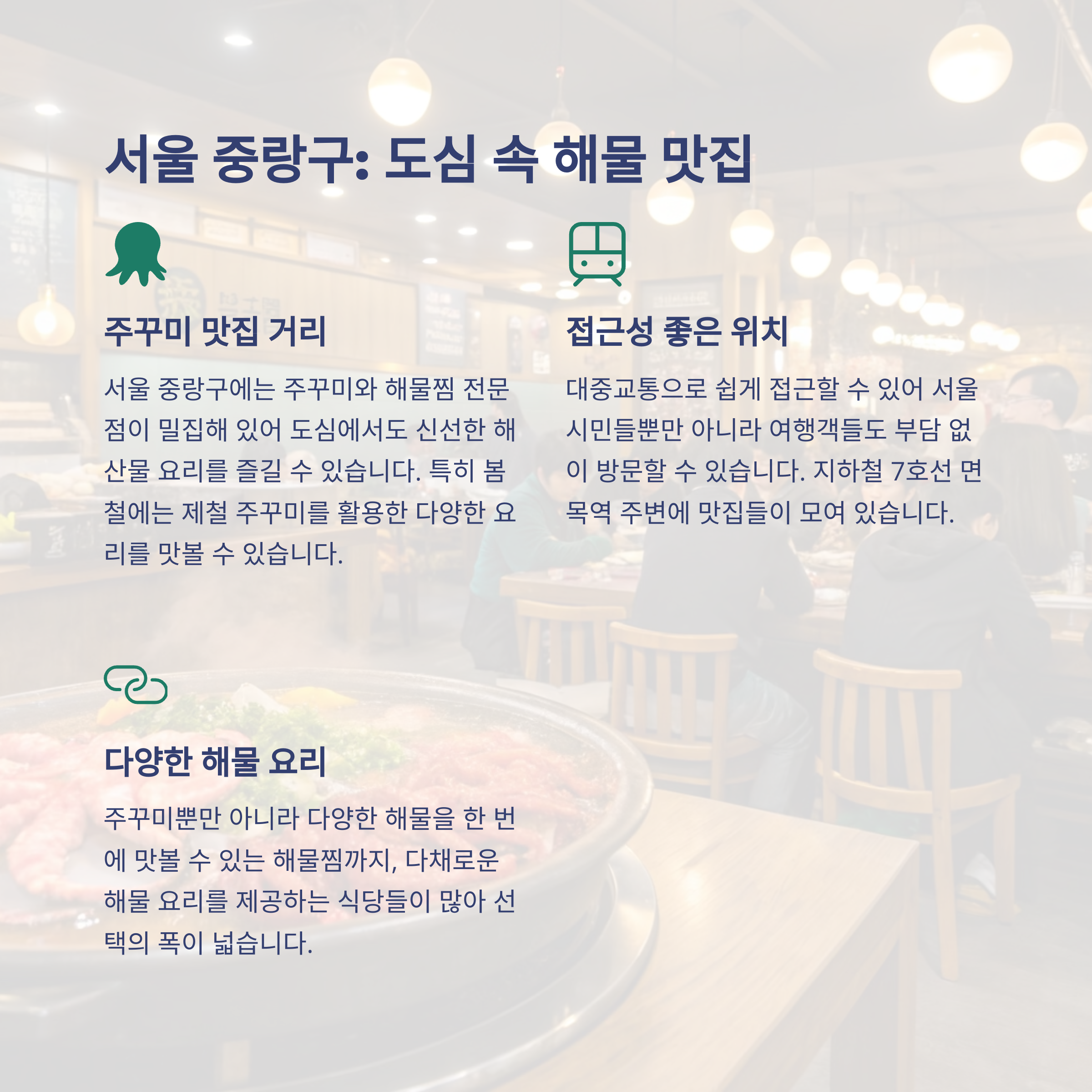 제주도는 딱새우회와 한치 물회로 봄철 미식가들의 사랑을 받고 있으며, 울진에서는 대게가 제철을 맞아 쫄깃하고 담백한 맛으로 많은 이들의 입맛을 사로잡고 있습니다. 서울 중랑구에서는 석순네쭈꾸미와 마산아구해물 맛집이 봄철 대표 해산물 요리로 인기를 끌고 있으며, 특히 1~2인 메뉴도 잘 구성되어 혼밥족들도 부담 없이 즐길 수 있습니다.