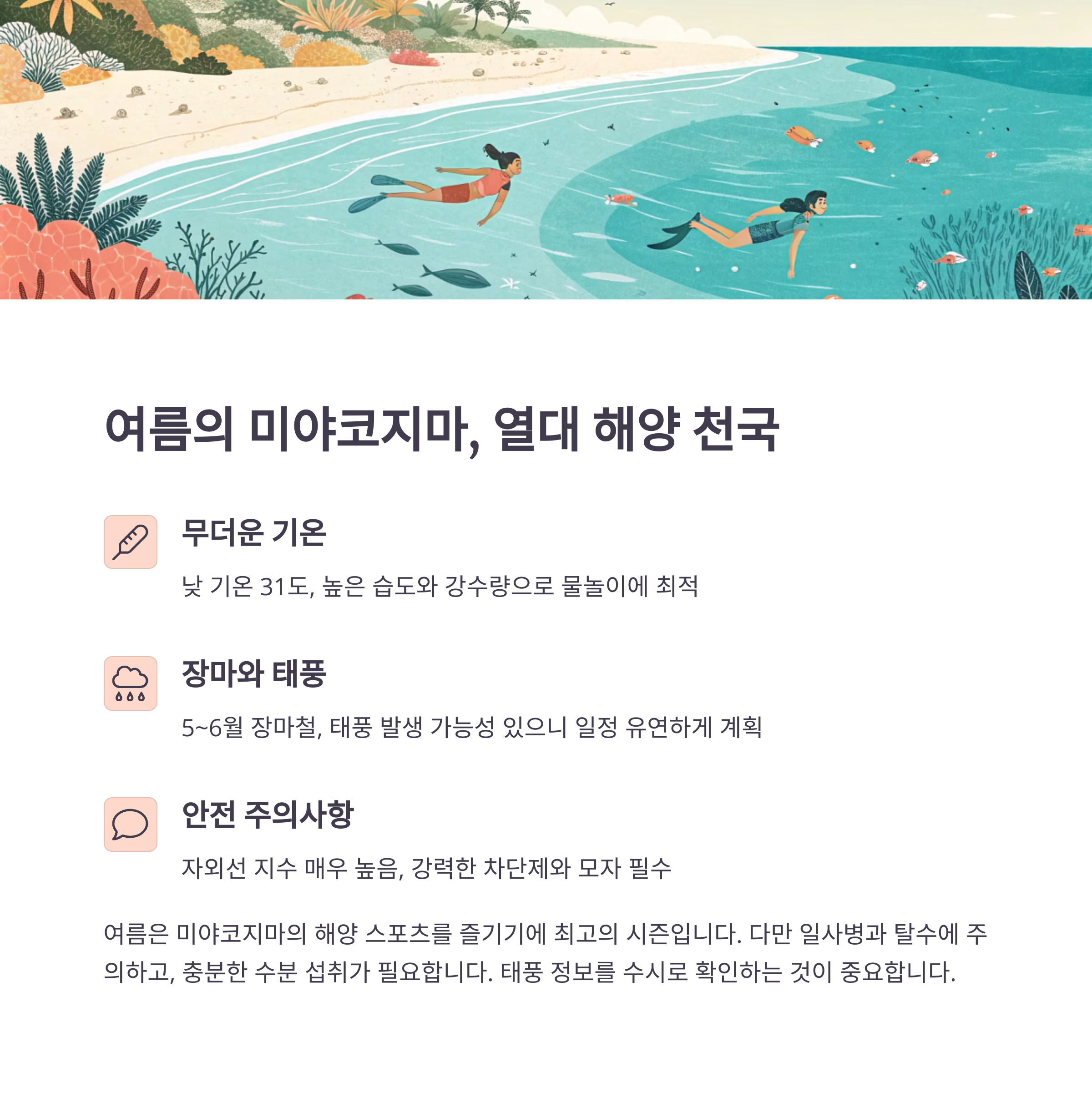 | 여름 (7~9월) | 25~31도 | 해양 스포츠 최적기 | 태풍 유의 |