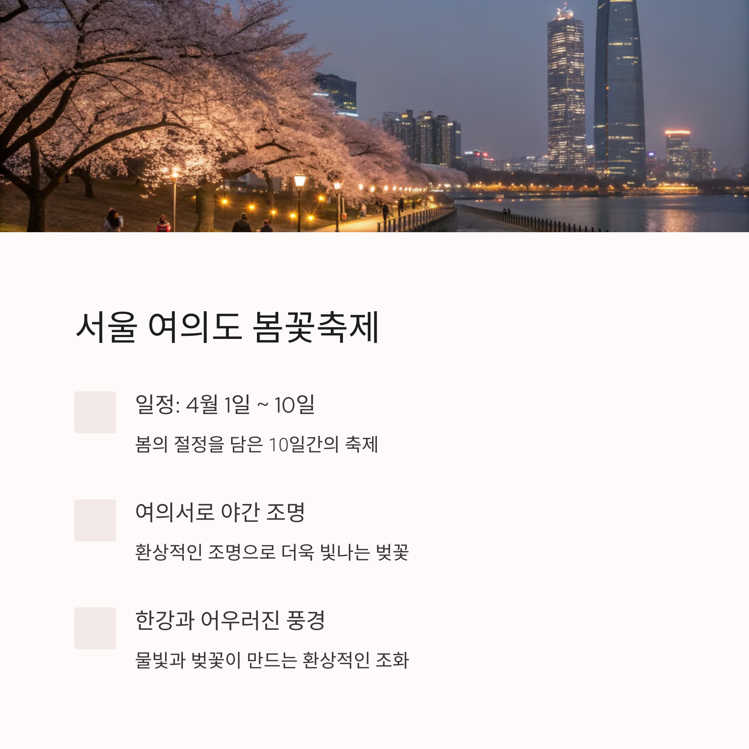 | 야간 벚꽃축제 | 밤에 즐기는 조명과 함께하는 벚꽃 감상 |