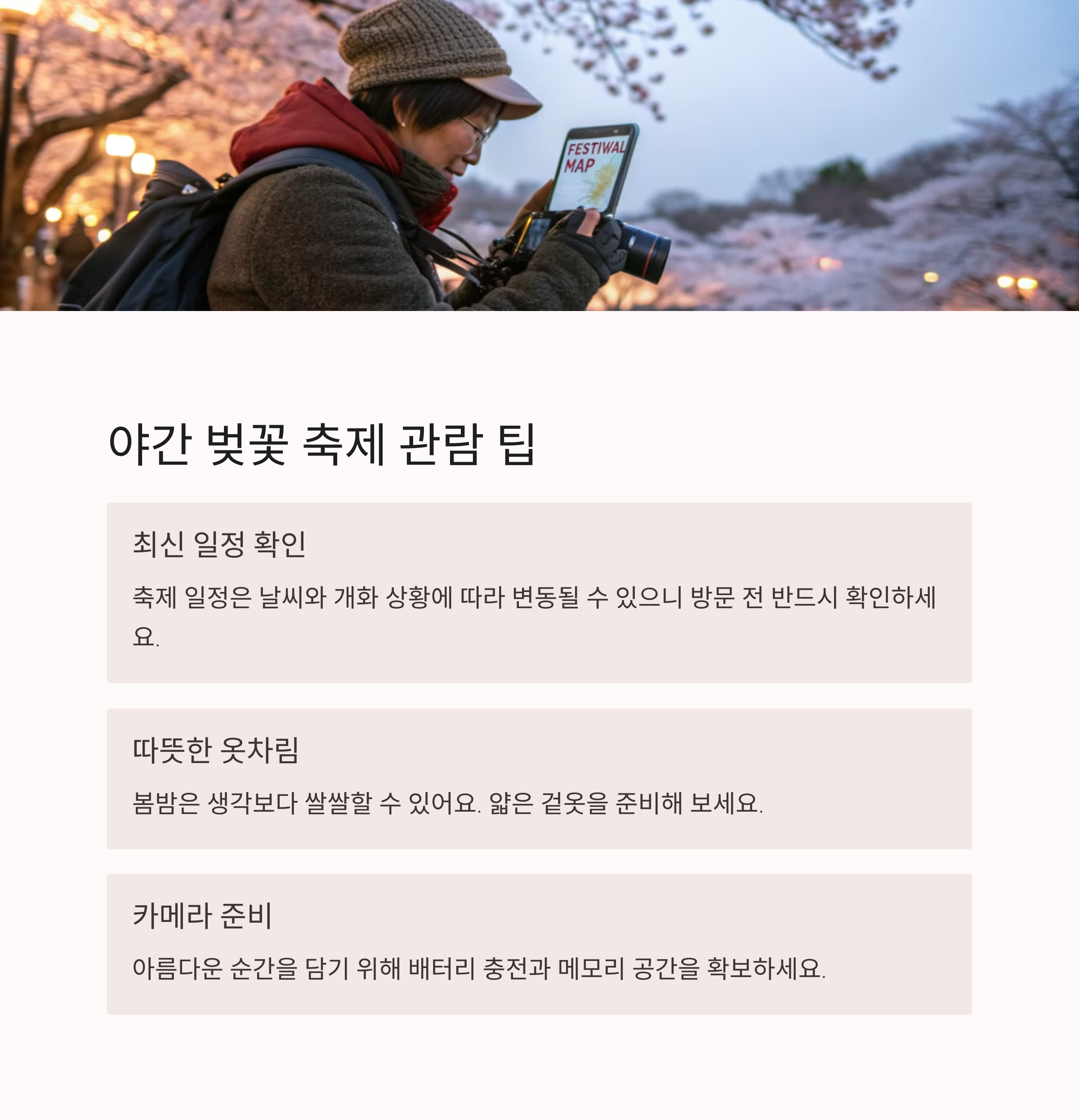 여러분이 방문한 최고의 벚꽃 명소는 어디인가요? 야간 벚꽃축제를 즐기는 꿀팁이 있다면 댓글로 함께 공유해 주세요. 다양한 정보가 서로에게 도움이 됩니다.