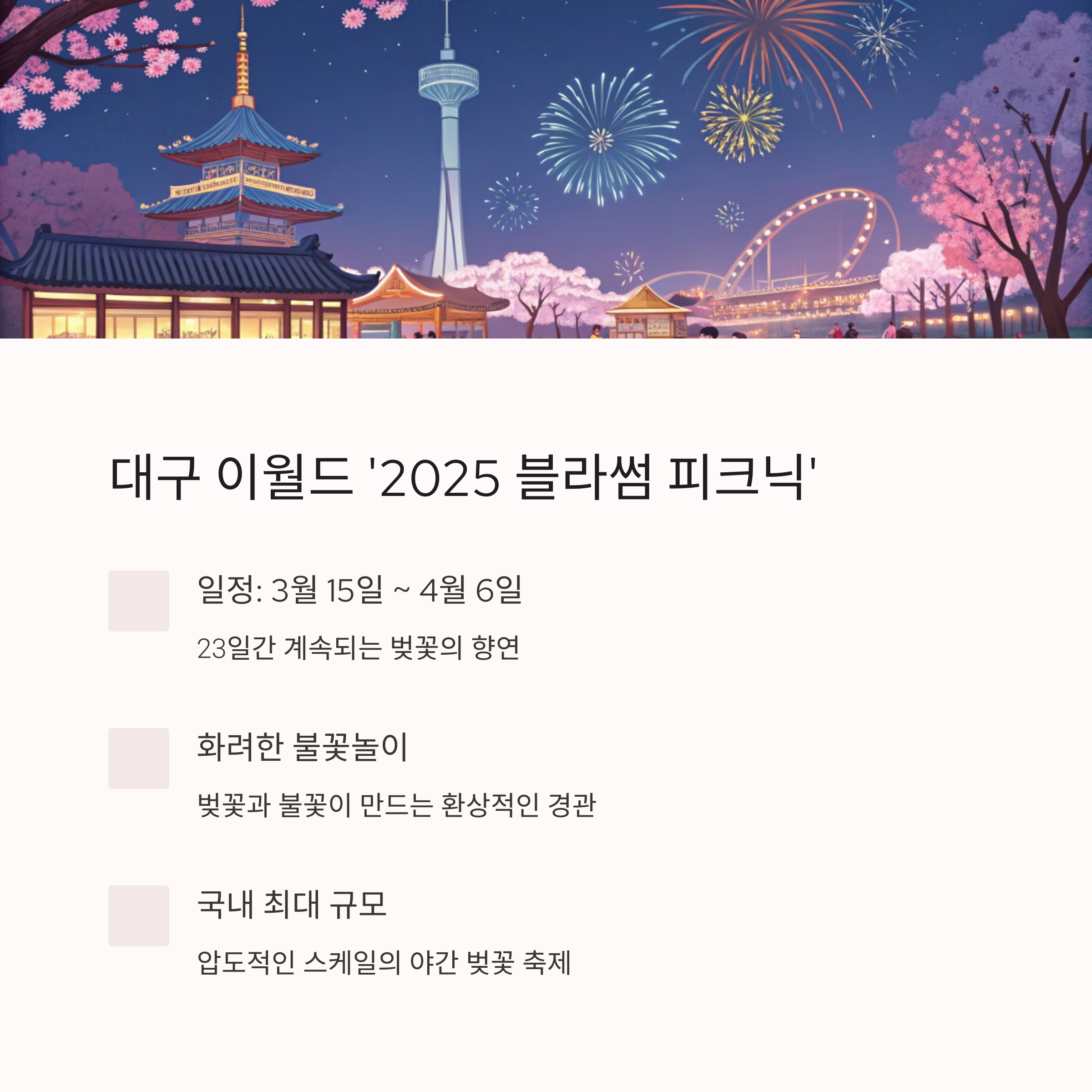 대표적인 야간 벚꽃 명소로는 대구 이월드의 ‘2025 블라썸 피크닉’이 있습니다. 이 축제는 매년 많은 사람들이 찾는 벚꽃 명소로, 밤하늘을 수놓는 불꽃놀이와 함께 벚꽃을 감상할 수 있는 특별한 기회를 제공합니다. 3월 15일부터 4월 6일까지 진행되며, 음악과 불빛이 어우러지는 야경 속 벚꽃은 마치 동화 속 한 장면처럼 느껴집니다.