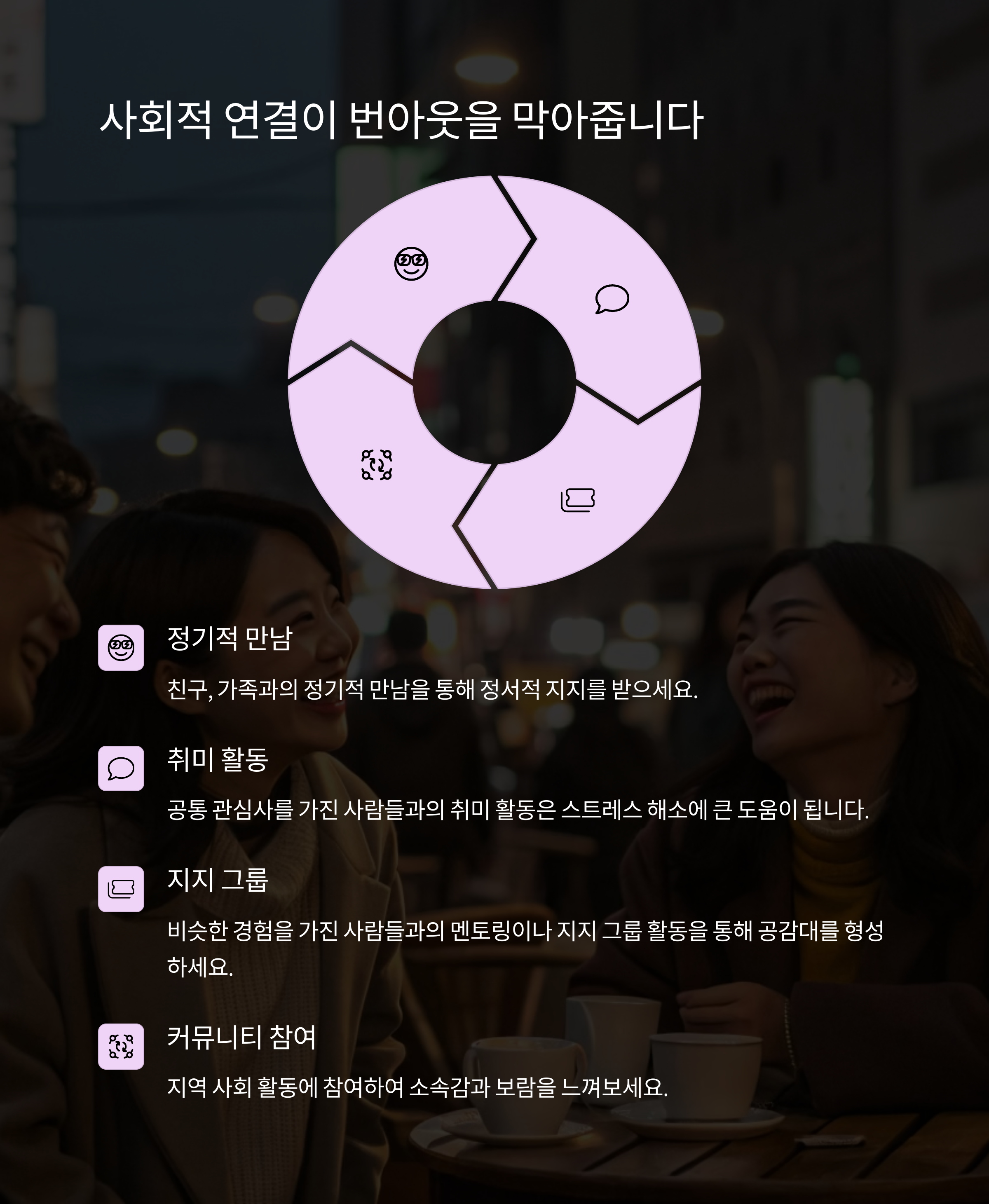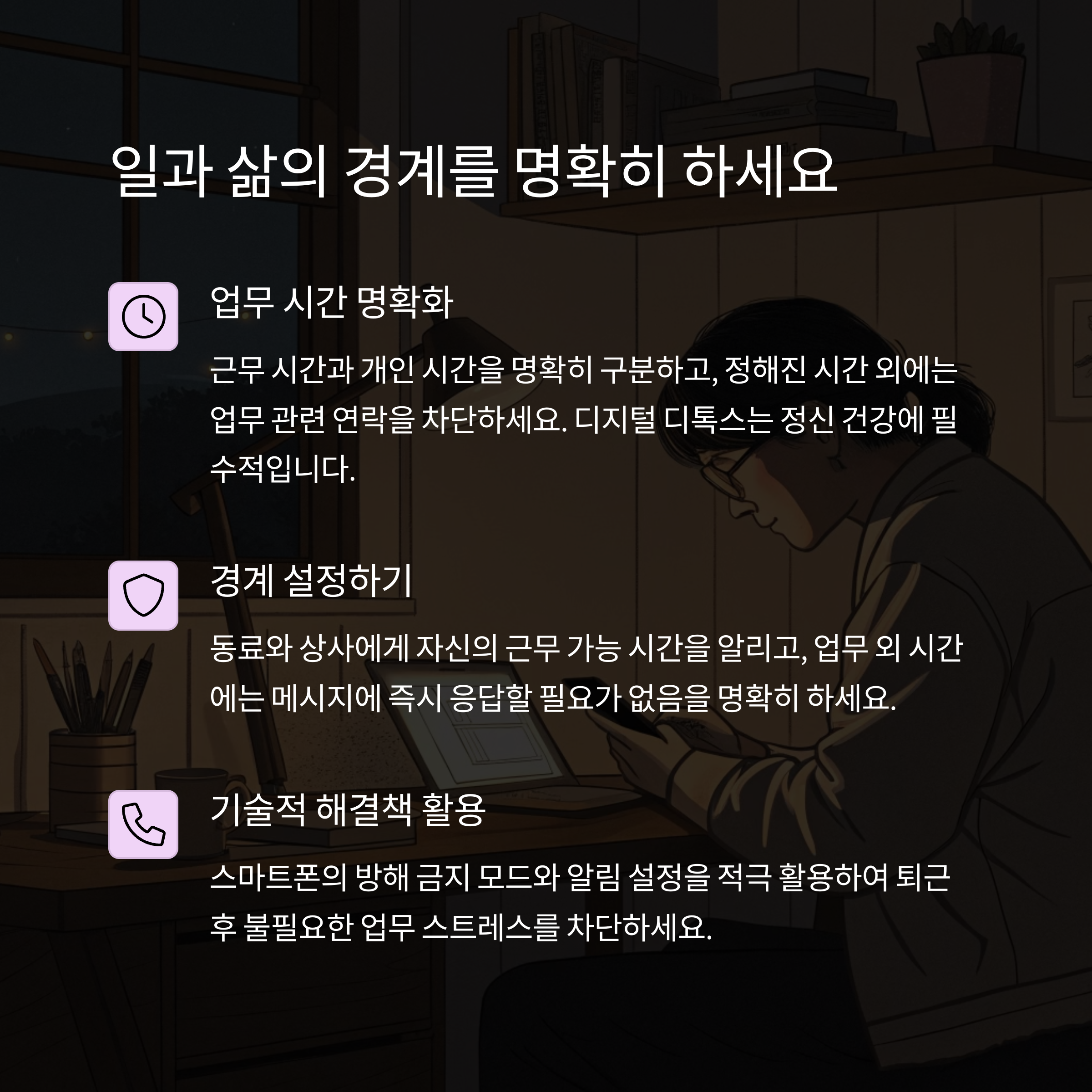 번아웃은 단순한 피로를 넘어 우리 삶에 많은 영향을 미치는 문제입니다. 경계 설정, 사회적 관계 유지, 작은 성취 인식과 같은 기본적인 습관이 누적될수록 회복력은 높아집니다. 중요한 것은 '완벽한 하루'가 아니라 '지속 가능한 루틴'입니다. 하루에 단 몇 분이라도 나만의 시간을 만들어 보세요. 여러분의 일상은 분명 달라질 수 있습니다.