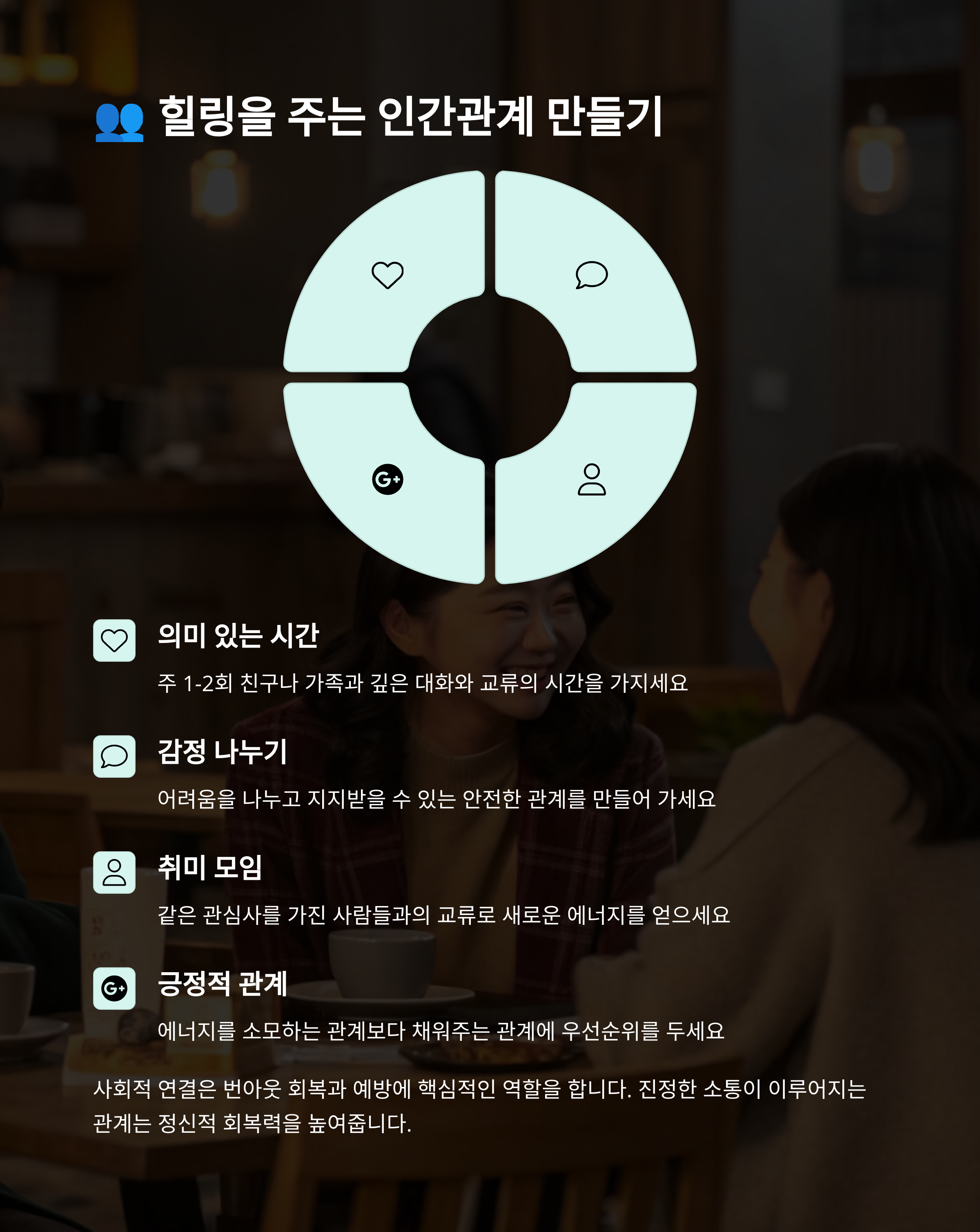 무엇보다 중요한 것은 정기적인 휴식과 사회적 연결입니다. 일상에서 짧은 휴식을 통해 마이크로 브레이크를 갖고, 정기적으로 가족이나 친구들과 교류하는 사회적 활동은 정신 건강을 지키는 중요한 기반이 됩니다. 또한 충분한 수면과 균형 잡힌 식사, 주기적인 운동을 포함한 셀프케어는 나를 지키는 리추얼의 핵심 요소입니다. 이러한 습관을 생활화하면 우리는 더 지치지 않고, 더욱 의미 있고 건강한 삶을 누릴 수 있습니다.