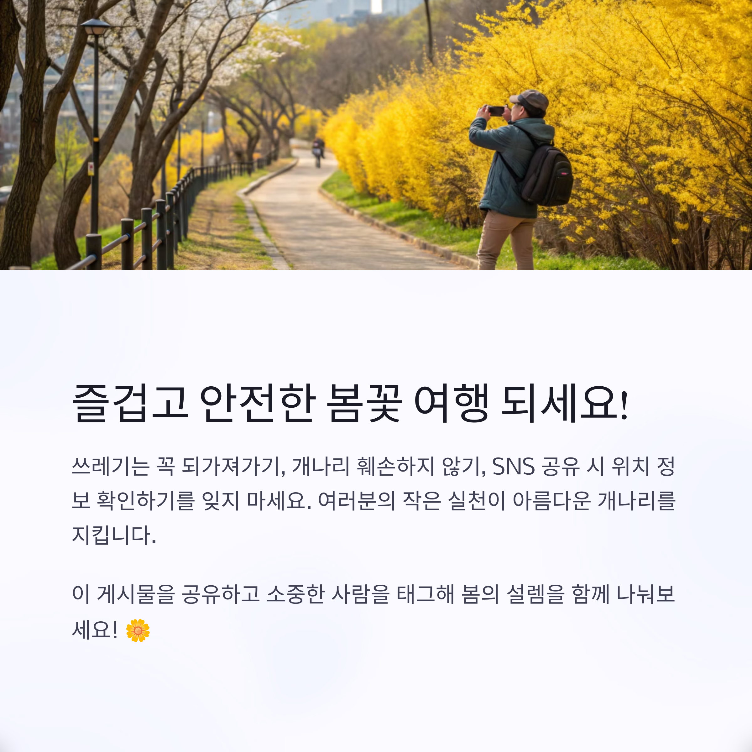 이번에 소개한 개나리 명소 중 가보고 싶은 곳은 어디인가요? 또는 여러분만의 숨은 봄꽃 명소가 있다면 댓글로 공유해 주세요! 여러분의 참여가 콘텐츠에 큰 힘이 됩니다 :)