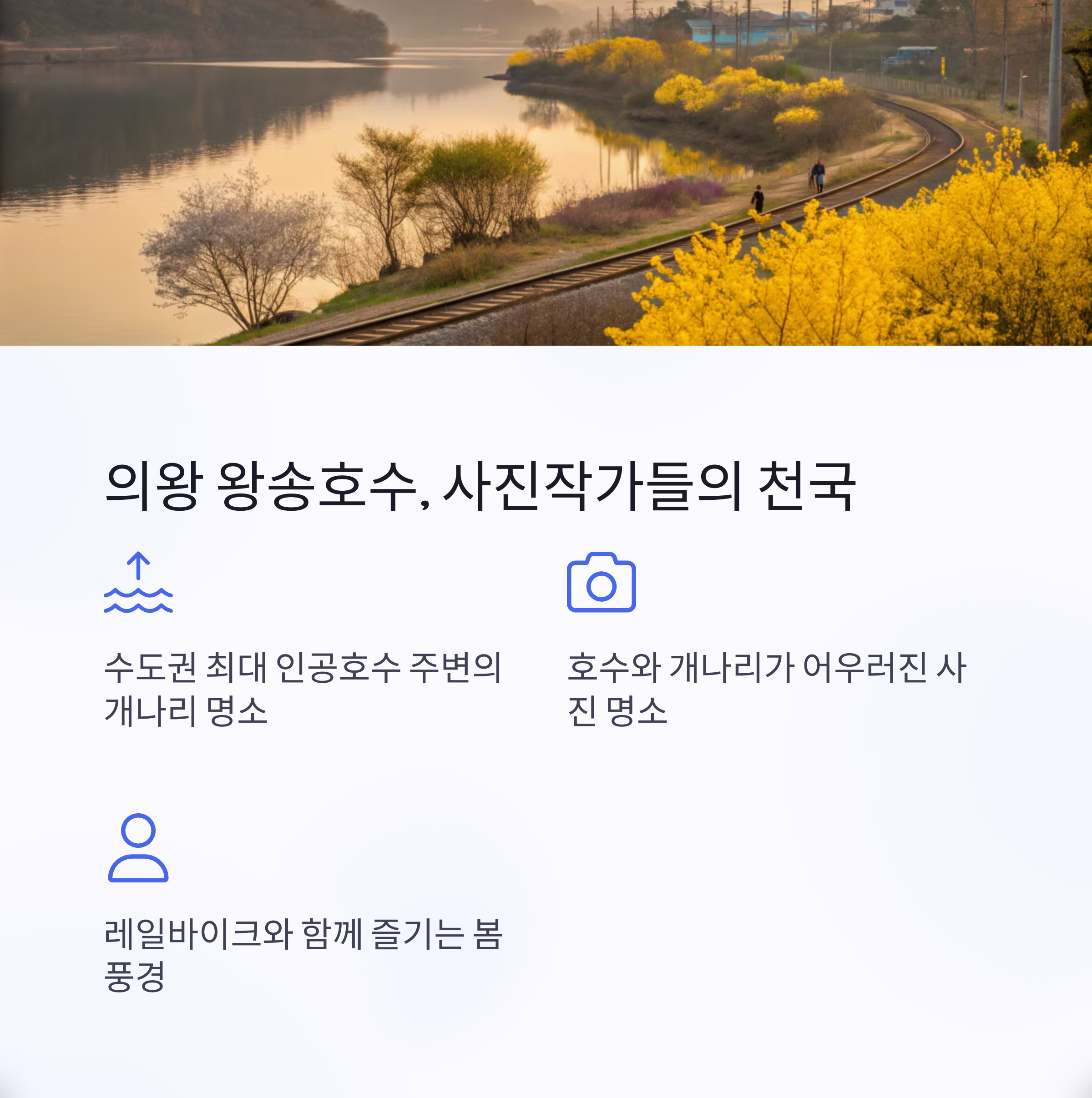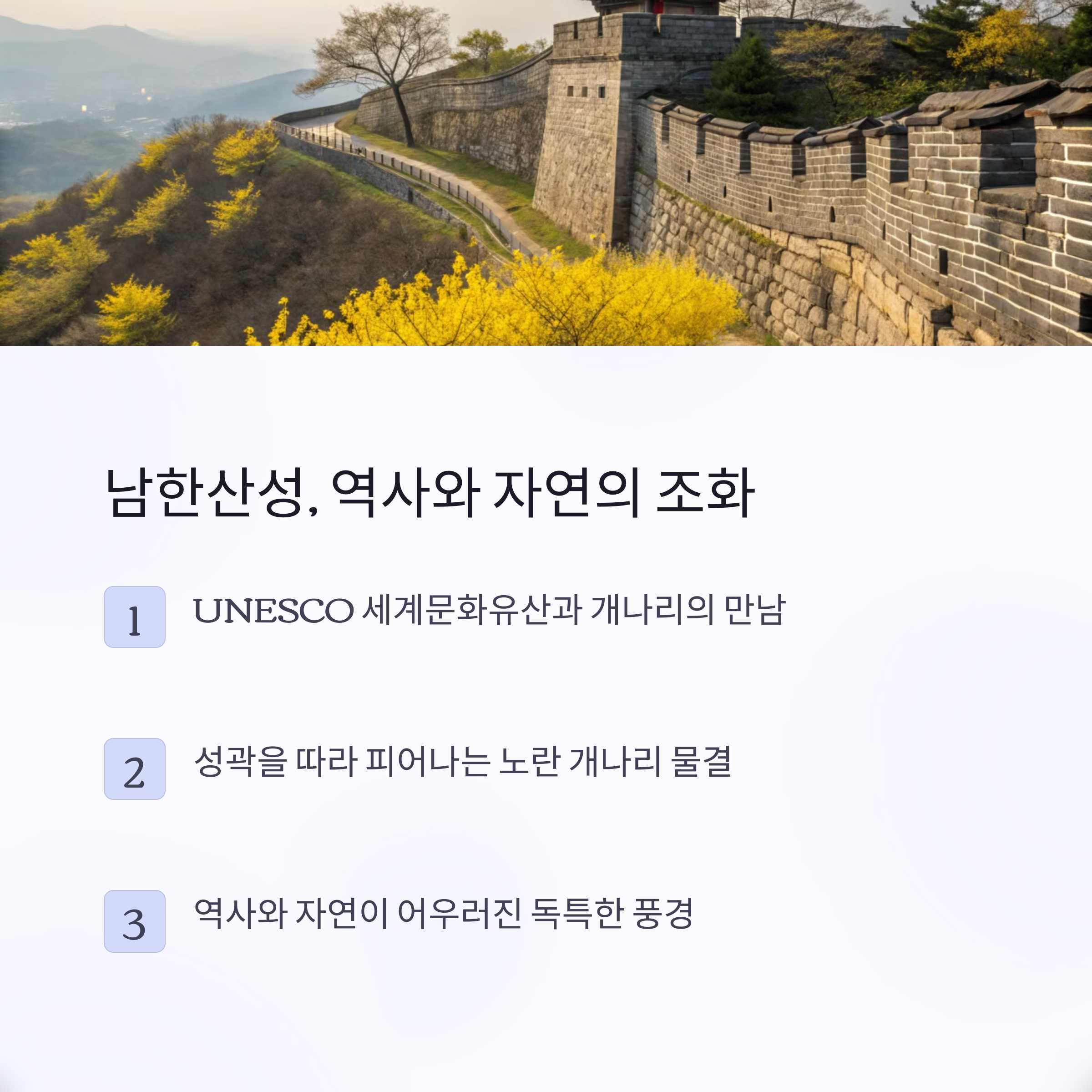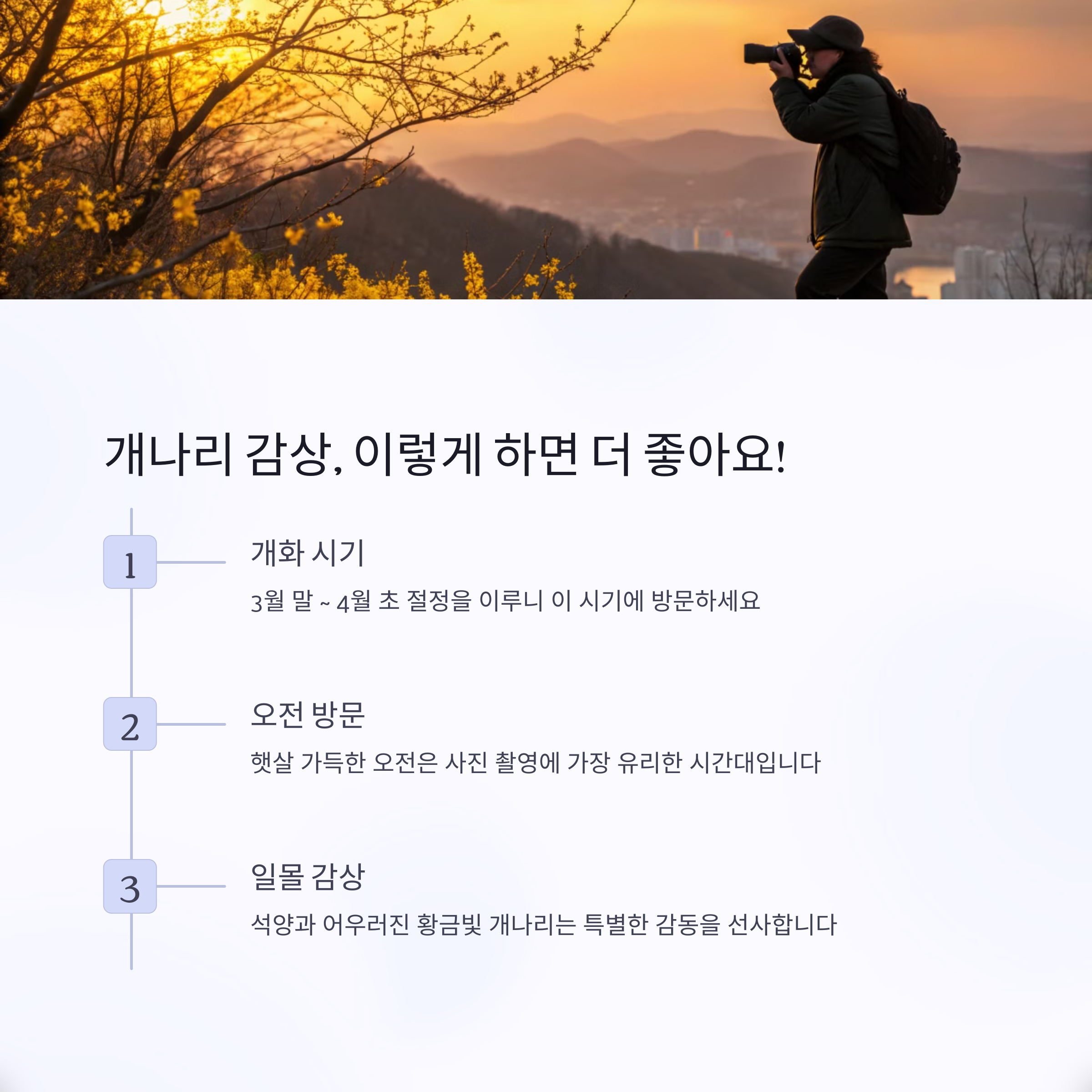 | 응봉산, 남산, 남한산성, 안산 호수공원, 왕송호수 | 3월 중순 ~ 4월 초까지 절정 | 도심뷰, 역사 감성, 가족 산책, 사진 명소 |
