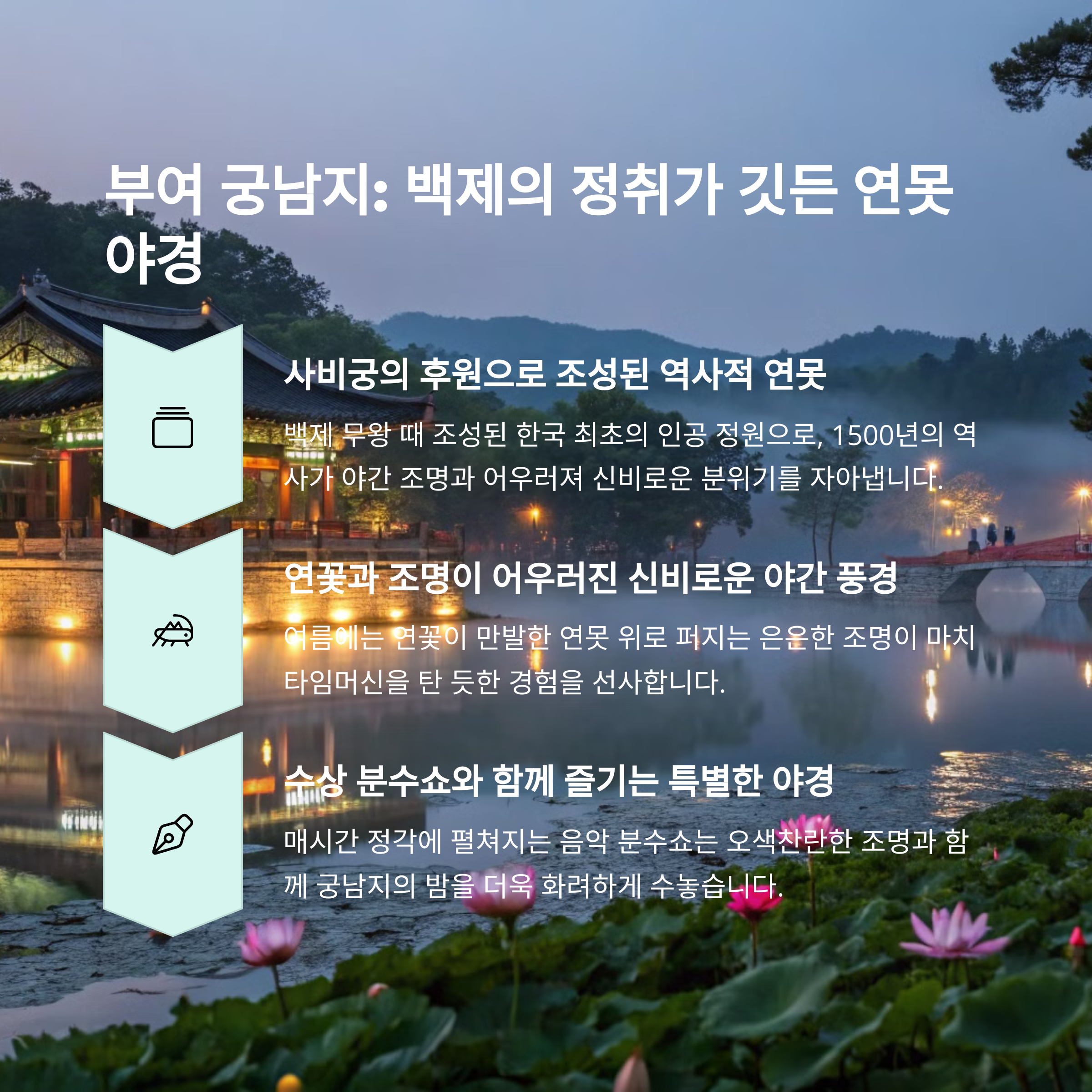 충주의 중앙탑사적공원과 부여 궁남지는 각각 고즈넉한 고대의 정취를 간직한 명소로, 야간 조명이 더해졌을 때 그 매력이 배가됩니다. 충주에서는 남한강을 따라 이어지는 산책로가 로맨틱한 분위기를 자아내며, 부여 궁남지는 조명이 연못 위에 비치는 모습이 마치 백제시대의 고요한 밤을 재현한 듯한 인상을 줍니다. 특히 이 두 장소는 주차 공간이 잘 마련되어 있어 접근성 면에서도 훌륭한 선택입니다. 붐비지 않는 분위기 속에서 역사의 숨결과 함께 조용한 밤을 느껴보세요.
